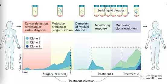 近年来,无论是作为研究对象还是在液体活检中监控癌症的发展,循环肿瘤DNA(ctDNA)的潜在应用范围随着基因组学和分子生物学技术的发展得到了极大地扩展。研究证明ctDNA在癌症的早期筛查、诊断、治疗策略的制定以及预后监测等全周期健康管理中表现出了巨大潜力。本文就ctDNA在癌症周期的监控以及在临床上的应用展开了论述。 一、cfDNA的发现历史 1948年,Mandel和Métais发现人血液中无细胞核酸片段。随后几十年间研究人员陆续研究了无细胞DNA(cfDNA)的起源和特征。在健康人群中,血浆中的cfDNA浓度往往介于1~10 ng/ml之间。1977年首例报告了患有癌症的血清中的cfDNA水平,同时在其他生理条件或病理情况下,如急性创伤,脑梗死,运动,移植和感染,血浆中cfDNA浓度也会相应的提高。直至1989年,Stroun及其同事们报道说,癌症患者血浆中有一些cfDNA来源于癌细胞。因此,cfDNA中的突变是癌症的高度特异性标记,由此得到循环肿瘤DNA(ctDNA)的概念。另外,1997年,Lo等鉴定了母体血浆中的胎儿DNA,推动了产前医学对于cfDNA的临床使用,包括性别测定,单基因疾病的鉴定和非整倍体无创产前诊断(NIPT),对唐氏综合征(21三体)的诊断等。 二、cfDNA的生物学起源 cfDNA被认为主要通过细胞分泌、凋亡和坏死从细胞释放出来的。除了在血液之外,研究人员在各种体液中检测到了cfDNA,包括尿液,脑脊液,胸膜液和唾液。同时,已有研究表明循环中cfDNA的半衰期为16分钟至2.5小时,这是ctDNA可以被应用于对癌症病人治疗效果临床实时监测的理论基础。cfDNA通过核酸酶作用从循环中清除,通过肾脏排泄到尿液中,同时肝脏和脾脏对cfDNA摄取,随后由巨噬细胞降解。 图1 cfDNA中变异的起源:细胞通过凋亡,坏死和分泌的组合释放cfDNA 三、ctDNA分析平台 由于ctDNA在cfDNA中所占的比例极为微小(<0.1%),将其应用在临床检测上是对痕量核酸检测技术的一个巨大挑战。目前具备极微量核酸基因突变检测能力的技术主要包括ARMS技术、数字PCR技术以及第二代测序(NGS)。 ARMS技术是被中国CFDA批准用于临床的血液检测方法,该技术具有操作简单,特异性好等特点,但是敏感性不如数字PCR,可检测的基因数量较少且只能检测已知位点。而数字PCR技术,具有极高的敏感性,可绝对定量;但该方法检测通量较低,且不能检测融合变异。 NGS技术可检测未知突变且检测基因数量不受限,虽然有一些亟待解决的问题,如在检测灵敏度方面虽不及数字PCR技术、稳定性上有所欠缺,但随着与肿瘤相关的基因位点不断增多,该方法能够同时在靶向测序以及更大范围的全基因组水平上对ctDNA进行监测,从而指导临床医师对肿瘤耐药突变的监测与研究,因此该方法具有很大的应用潜力。 表1 ctDNA分析技术平台的比较与应用 四、ctDNA在癌症治疗过程中的应用 随着核酸检测相关技术的迅猛发展, ctDNA已经被逐步应用于临床转化中,如在癌症的早期筛查、诊断、指导用药和预后监测。 1.癌症的早期筛查:在通过影像学手段未能发现病灶时对被检测者进行早期筛查,判断肿瘤原发灶;对于显现出症状的患者,通过ctDNA基因分型技术对患者的特异性的癌症进行检测,可以加快准确诊断、治疗。 2.治疗选择:目前,对于癌症患者,特别是具有快速疾病进程的患者通常采用的药物治疗手段是靶向药物,这就需要对患者的相应基因上的位点进行分型,传统的方法是采用肿瘤组织的DNA进行基因分型,但在临床应用过程中,无法获得足够的肿瘤组织或者无法获得经过治疗后的肿瘤组织,ctDNA极好的解决了这一问题。 3.实时监控:如前所述,ctDNA检测作为一种实时的无创的检测方法,能够真实的反映实体瘤组织中的基因突变图谱与频率,将有助于临床医师及时的了解患者的治疗后疾病进展情况。 4.最小残留病灶以及复发风险的预后评估:在治疗前或治疗后,通过监测患者体内ctDNA,对其体内的实体瘤相关基因进行监测,将有助于临床医师对进展风险进行相应的评估,对复发风险高的患者采取更多的辅助治疗手段,而对低风险患者可以有效地避免过度治疗。 图3 ctDNA在癌症治疗过程中的应用 参考文献: Wan J C M, Massie C, Garciacorbacho J, et al. Liquid biopsies come of age: towards implementation of circulating tumour DNA[J]. Nature Reviews Cancer, 2017, 17(4):223. |