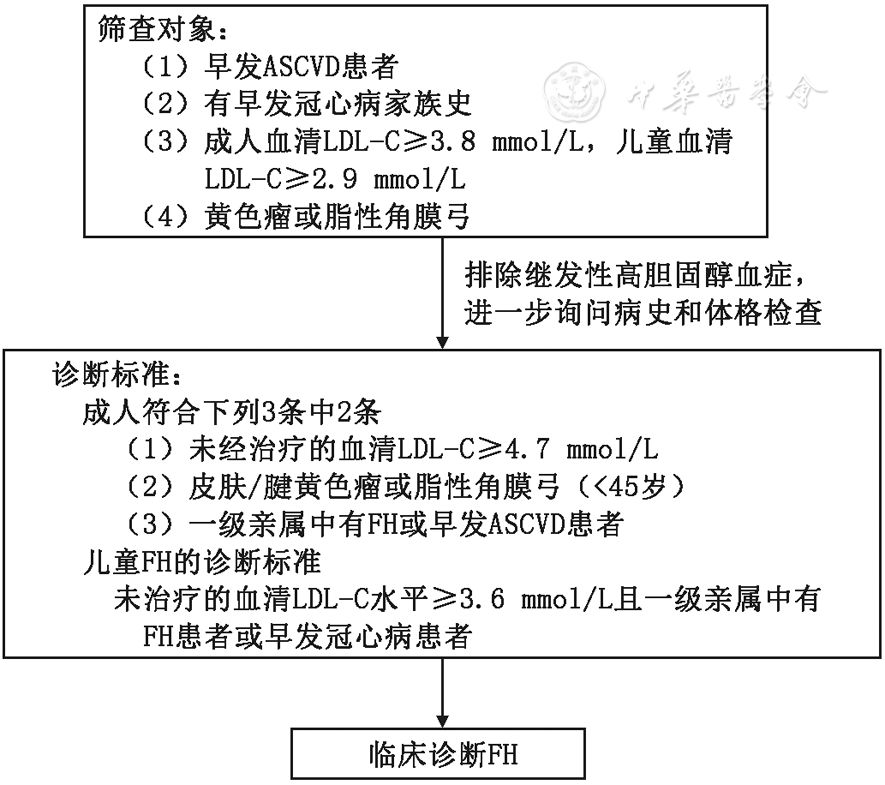 注:DLCN为荷兰临床脂质网络标准;分值>8分为确诊家族性高胆固醇血症(FH)、6~8分为FH可能性大,3~5分为可能的FH;LDL-C为低密度脂蛋白胆固醇,LDLR为低密度脂蛋白受体,Apo B为载脂蛋白B 筛查与诊断 早期筛查和诊断是降低FH患者ASCVD发病风险,改善临床预后的重要举措。 (一)筛查流程和内容 筛查可分为针对所有人群的普遍筛查和局限于某些重点人群的选择性筛查,本共识建议采用后者。根据我国人群血清胆固醇水平的特点以及FH的临床表现,为确定FH可疑人群,促进FH患者早期诊断和早期治疗,建议符合下列任意1项者要进入FH的筛查流程:(1)早发ASCVD(男性<55岁或女性<65岁即发生ASCVD);(2)成人血清LDL-C≥3.8 mmol/L(146.7 mg/dl),儿童血清LDL-C≥2.9 mmol/L(112.7 mg/dl),且能除外继发性高脂血症者;(3)有皮肤/腱黄素瘤或脂性角膜弓(<45岁);(4)一级亲属中有上述3种情况。 筛查需要完成以下内容:(1)家族史:询问早发ASCVD及FH家族史,家族成员(特别是一级亲属)的血清LDL-C水平,以及是否存在黄素瘤和脂性角膜弓等FH特征性的临床表现。(2)临床病史:是否为早发ASCVD患者,除关注冠心病的发病外,不要忽略卒中和外周动脉粥样硬化病史;同时要询问是否存在可使LDL-C水平继发增高的疾病,例如甲状腺功能减低、肾病综合征以及某些药物等,特别要注意除外和FH临床表型相似性较大的谷固醇血症。(3)体格检查:除规范的全身查体外,要特别关注有无黄色瘤和脂性角膜弓。对存在跟腱黄素瘤,或脂性角膜弓(<45岁)的患者要高度怀疑FH。(4)检测血清LDL-C水平:是筛查的必检项目。虽然基因检测是FH诊断的金标准,但无论基因突变检查有无异常发现,对可疑人群均需进行血LDL-C水平检测。 本共识建议一旦发现FH患者,应尽可能开展针对FH患者一级亲属的级联式筛查(cascade screening)。级联式筛查是效价比较高的FH筛查方式,新英格兰在过去20年内通过这种方式至少发现了27 000例FH患者,中国既往FH的级联筛查也效果显著。 (二)诊断标准 根据中国人群血LDL-C水平和FH的特点,并借鉴国外的经验,本共识建议成人符合下列标准中的2项即可诊断为FH:(1)未接受调脂药物治疗的患者血清LDL-C水平≥4.7 mmol/L(180 mg/dl);(2)有皮肤/腱黄色瘤或<45岁的人存在脂性角膜弓;(3)一级亲属中有FH或早发ASCVD,特别是冠心病患者。儿童FH的诊断标准:未治疗的血LDL-C水平≥3.6 mmol/L(140 mg/dl)且一级亲属中有FH患者或早发冠心病患者。 对于LDLR、Apo B、PCSK9和LDLRAP1基因检测到致病突变者也可诊断为FH。FH的筛查与临床诊断流程见图1。 ▲图1 FH的筛查与临床诊断流程 (三)鉴别诊断 在确诊FH前需要除外一些可能引起血LDL-C水平升高的疾病。 1.继发性高胆固醇血症: 甲状腺功能减退、肾病综合征等因素可出现继发性高胆固醇血症。 2.植物固醇血症: FH和植物固醇血症都以早发冠心病及全身黄色瘤为典型表现,植物固醇血症也是由基因突变所致,但二者的致病基因不同。通过血清植物固醇水平测定或基因检测可以鉴别。 治疗 ▲图2 家族性高胆固醇血症治疗流程 本文来源:选自《中华心血管病杂志》, 2018,46(2) : 99-103. | |||||||||||||||||||||||||||||||||||||||||||||||||||||||||