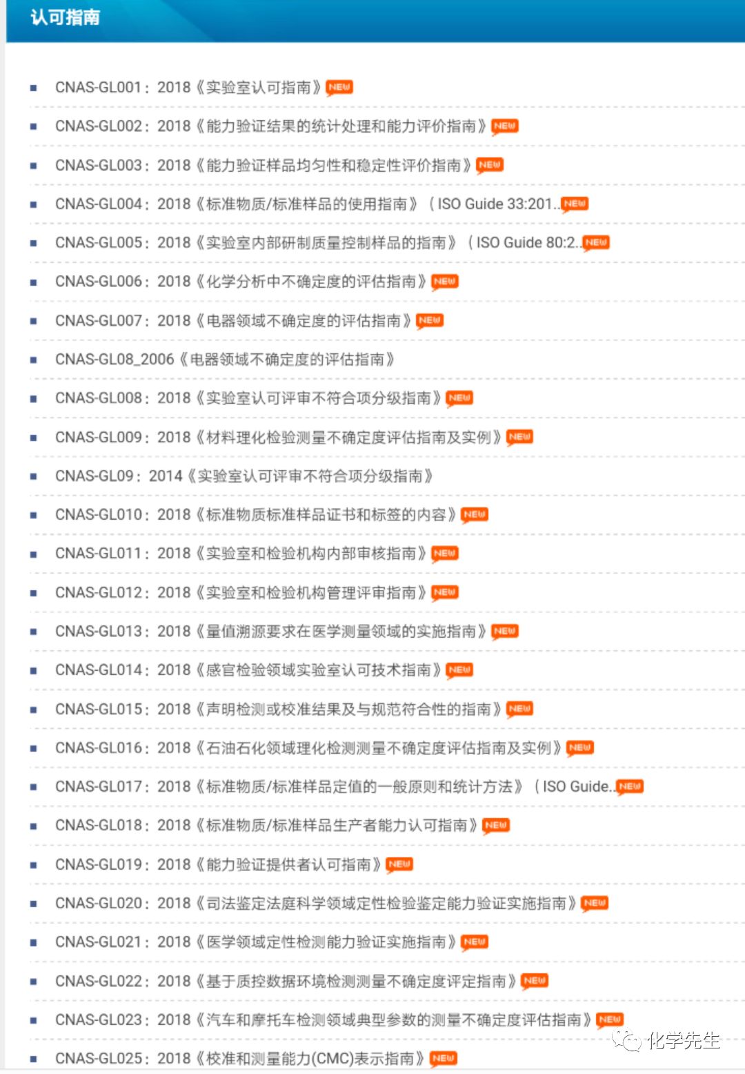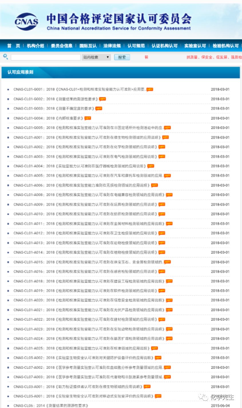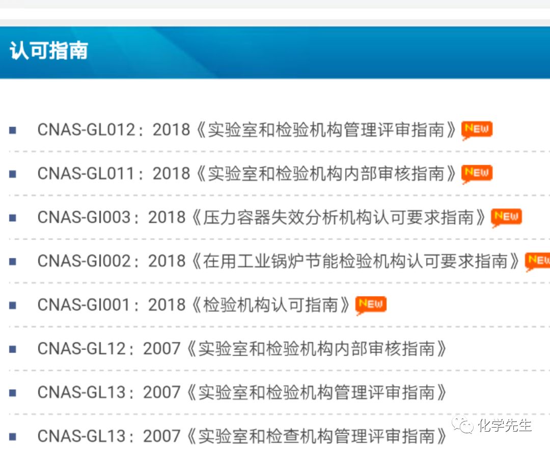 今天(2018.03.01)中国国家合格评定认可委员会(CNAS)在官网发布了CNAS2018版《实验室认可指南》、《实验室认可准则》、《实验室认可方案》、《实验室认可应用准则》、《实验室认可技术说明》和CNAS2018版《检验机构认可指南》、《检验机构认可准则》、《检验机构认可方案》、《检验机构认可应用准则》。这些文件将在2018年09月01日正式生效,所以大家今年有得忙了。准备好加班加点吧。~~~我们在第一时间把相关文本文件进行汇编整理,以方便大家学习。在文末可以直接打包下载全部文本。也欢迎大家把文章转发给其他检验检测同行,大家一起加班,学习! CNAS2018版实验室认可指南 CNAS-GL001:2018《实验室认可指南》2018-03-01 CNAS-GL002:2018《能力验证结果的统计处理和能力评价指南》2018-03-01 CNAS-GL003:2018《能力验证样品均匀性和稳定性评价指南》2018-03-01 CNAS-GL004:2018《标准物质/标准样品的使用指南》(ISO Guide 33:201..2018-03-01 CNAS-GL005:2018《实验室内部研制质量控制样品的指南》(ISO Guide 80:2..2018-03-01 CNAS-GL006:2018《化学分析中不确定度的评估指南》2018-03-01 CNAS-GL007:2018《电器领域不确定度的评估指南》2018-03-01 CNAS-GL08_2006《电器领域不确定度的评估指南》2015-06-04 CNAS-GL008:2018《实验室认可评审不符合项分级指南》2018-03-01 CNAS-GL009:2018《材料理化检验测量不确定度评估指南及实例》2018-03-01 CNAS-GL09:2014《实验室认可评审不符合项分级指南》2015-06-04 CNAS-GL010:2018《标准物质标准样品证书和标签的内容》2018-03-01 CNAS-GL011:2018《实验室和检验机构内部审核指南》2018-03-01 CNAS-GL012:2018《实验室和检验机构管理评审指南》2018-03-01 CNAS-GL013:2018《量值溯源要求在医学测量领域的实施指南》2018-03-01 CNAS-GL014:2018《感官检验领域实验室认可技术指南》2018-03-01 CNAS-GL015:2018《声明检测或校准结果及与规范符合性的指南》2018-03-01 CNAS-GL016:2018《石油石化领域理化检测测量不确定度评估指南及实例》2018-03-01 CNAS-GL017:2018《标准物质/标准样品定值的一般原则和统计方法》(ISO Guide..2018-03-01 CNAS-GL018:2018《标准物质/标准样品生产者能力认可指南》2018-03-01 CNAS-GL019:2018《能力验证提供者认可指南》2018-03-01 CNAS-GL020:2018《司法鉴定法庭科学领域定性检验鉴定能力验证实施指南》2018-03-01 CNAS-GL021:2018《医学领域定性检测能力验证实施指南》2018-03-01 CNAS-GL022:2018《基于质控数据环境检测测量不确定度评定指南》2018-03-01 CNAS-GL023:2018《汽车和摩托车检测领域典型参数的测量不确定度评估指南》2018-03-01 CNAS-GL025:2018《校准和测量能力(CMC)表示指南》2018-03-01 CNAS-GL026:2018《无线电领域测量不确定度评估指南及实例》2018-03-01 CNAS-GL027:2018《化学分析实验室内部质量控制指南——控制图的应用》2018-03-01 CNAS-GL028:2018《临床微生物检验程序验证指南》2018-03-01 CNAS-GL029:2018《基因扩增领域检测实验室认可指南》2018-03-01 CNAS-GL030:2018《企业内部检测实验室认可指南》2018-03-01 CNAS-GL031:2018《动物检疫二级生物安全实验室认可指南》2018-03-01 CNAS-GL032:2018《能力验证的选择核查与利用指南》2018-03-01 CNAS2018版实验室认可方案 CNAS-CL01-S01:2018《中国计量科学研究院认可方案》2018-03-01 CNAS-CL01-S02:2018《“能源之星”实验室认可方案》2018-03-01 CNAS-CL01-S03:2018《反兴奋剂实验室认可方案》2018-03-01 CNAS-CL01-S04:2018《EPA复合木制品检测实验室认可方案》2018-03-01 CNAS2018版实验室认可准则 CNAS-CL01:2018《检测和校准实验室能力认可准则》2018-03-01 CNAS-CL06:2018《实验动物饲养和使用机构质量和能力认可准则》2018-03-01 CNAS-CL07:2018《医学参考测量实验室认可准则》2018-03-01 CNAS2018版实验室认可说明 CNAS实验室认可说明文件清单2018-02-28 CNAS-EL-12:2018《石油石化检测领域实验室认可能力范围表述说明》2018-02-28 CNAS2018版实验室认可应用准则 CNAS-CL01-G001:2018《CNAS-CL01<检测和校准实验室能力认可准则>应用要..2018-03-01 CNAS-CL01-G002:2018《测量结果的溯源性要求》2018-03-01 CNAS-CL01-G003:2018《测量不确定度的要求》2018-03-01 CNAS-CL01-G004:2018《内部校准要求》2018-03-01 CNAS-CL01-G005:2018《检测和校准实验室能力认可准则在非固定场所外检测活动中的应..2018-03-01 CNAS-CL01-A001:2018《检测和校准实验室能力认可准则在微生物检测领域的应用说明》2018-03-01 CNAS-CL01-A002:2018《检测和校准实验室能力认可准则在化学检测领域的应用说明》2018-03-01 CNAS-CL01-A003:2018《检测和校准实验室能力认可准则在电气检测领域的应用说明》2018-03-01 CNAS-CL01-A004:2018《实验室能力认可准则在医疗器械检测领域的应用说明》2018-03-01 CNAS-CL01-A005:2018《检测和校准实验室能力认可准则在汽车和摩托车检测领域的应用..2018-03-01 CNAS-CL01-A006:2018《检测和校准实验室能力准则在无损检测领域的应用说明》2018-03-01 CNAS-CL01-A008:2018《检测和校准实验室能力认可准则在电磁兼容检测领域的应用说明》2018-03-01 CNAS-CL01-A009:2018《检测和校准实验室能力认可准则在玩具检测领域的应用说明》2018-03-01 CNAS-CL01-A010:2018《检测和校准实验室能力认可准则在纺织检测领域的应用说明》2018-03-01 CNAS-CL01-A011:2018《检测和校准实验室能力认可准则在金属材料检测领域的应用说明》2018-03-01 CNAS-CL01-A012:2018《检测和校准实验室能力认可准则在卫生检疫领域的应用说明》2018-03-01 CNAS-CL01-A013:2018《检测和校准实验室