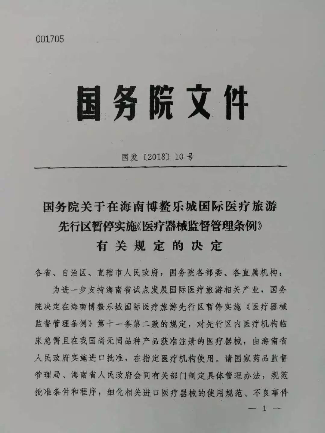 “国九条”政策落地博鳌乐城又有新进展!记者4月4日从省卫生计生委获悉,国务院于4月2日印发《国务院关于在海南博鳌乐城国际医疗旅游先行区暂停实施<医疗器械监督管理条例>有关规定的决定》(以下简称《决定》)。《决定》指出,为进一步支持海南省试点发展国际医疗旅游相关产业,国务院决定在海南博鳌乐城国际医疗旅游先行区暂停实施《医疗器械监督管理条例》第十一条第二款的规定,对先行区内医疗机构临床急需且在我国尚无同品种产品获准注册的医疗器械,由海南省人民政府实施进口批准,在指定医疗机构使用。
