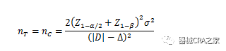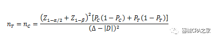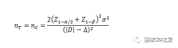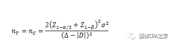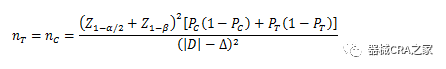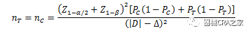 以下公式中,nT、nC分别为试验组和对照组的样本量;Z1-α/2、Z1-β为标准正态分布的分数位,当α=0.05时,Z1-α/2=1.96,当β=0.2时,Z1-β=0.842;(Z1-α/2+Z1-β2=7.85