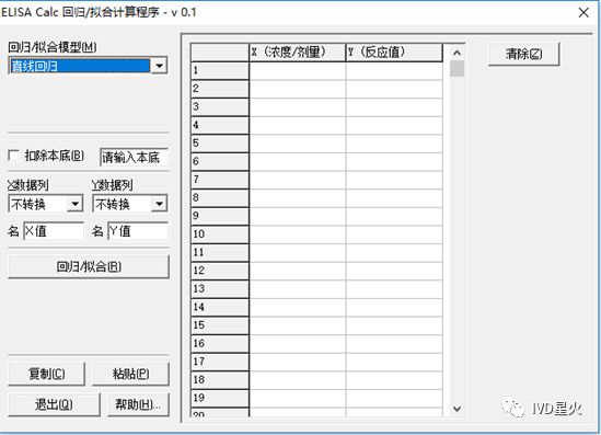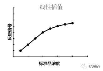 定量体外诊断试剂盒,测定未知样本待测物的浓度含量,是以系列浓度标准品测得剂量反应曲线,即得到标准曲线,再以此计算待测样本的浓度。 当我们得到一系列已知浓度标准品的反应后,就会去建立函数关系,数学上称曲线拟合,根据试剂反应信号趋势的不同会用到不同拟合方式。 反应中待测物质和免疫反应之间的关系一般不是简单的直线,这就存在系列浓度标准品与检测结果有多种曲线拟合方式。不同类型的试剂由于待测物不同、检测方法不同等,试剂反应信号趋势并不相同。建立标准曲线,选择合适的数学模型(函数),提高剂量反应曲线绘制的准确度,从而获得较为精确的待测物浓度结果。一般单纯的线性回归不能说明真实的免疫反应情况,因此标准曲线主要是非线性拟合。 一般采用差值法(内插法)或者曲线拟合的方式获得标准曲线。 差值法(Interpolation Method):用函数f (x)在某区间中已知的若干点的函数值,作出适当的特定函数,在区间的其他点上用这特定函数的值作为函数f (x)的近似值。该方法以假定数据正确为前提,要求以某种方法描述数据点之间所发生关系或规律。即插值是找到一个或几个分片光滑的连续曲面来穿过这些点。 曲线拟合(Curve Fitting):用连续曲线近似地刻画或比拟平面上离散数据点所表示的坐标之间的函数关系的一种数据处理方法。将测得许多离散的实验数据(比如标准品浓度与测定信号值),寻找一条连续光滑曲线来近似反映已知数据组间存在的某种关系的一般趋势,所得近似函数f(x)可以很好地逼近离散数据,这个函数逼近的过程称为曲线拟合。这条光滑曲线,能最佳地拟合数据,通常不必要经过所有数据点,甚至可能不经过任何数据点,曲线拟合公式反映的是数据点整体的变化趋势。 拟合与差值的比较 运算过程上的区别: 拟合:将数据点用最恰当的曲线描述出来,反映问题的规律和趋势,是从特殊到一般。 插值:在知道曲线的形状后,得出某些具体点的性质的过程,是从一般到特殊。 求解误差上的区别: 拟合:在误差不可避免时考虑观察点的误差,以偏差的某种最小为拟合标准。 插值:在观测点处无误差。 常用的数学函数举例 一、插值法: 插值法又可分为线性插值法和样条插值法。 1. 线性插值法(Linear interpolation): 线性插值法是指使用连接两个已知量的直线来确定在这两个已知量之间的一个未知量的值的方法。 最简单的例子:假设我们已知坐标(x0,y0)与(x1,y1),要得到[x0,x1]区间内某一位置x在直线上的值。根据图中所示,我们得到两点式直线方程: