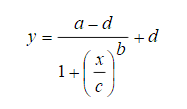 可以通过增加多个校准数据点的方法来使线性插值就更精确。线性插值法通常适用于线性范围宽且校准点足够多的情况,或者用于标准曲线的校准。 2. 样条插值法(Spline interpolation): 样条插值法是一种以可变样条来作出一条经过一系列点的光滑曲线的数学方法,是一种改进的分段插值。 插值样条是由一些多项式组成的,每一个多项式都是由相邻的两个数据点决定的,这样,任意的两个相邻的多项式以及它们的导数在连接点处都是连续的。当希望曲线密切遵循单个的校准物数据点时使用,此时要求数据非常精密,需要有多个浓度校准物。在校准数据点越多时,其拟合的效果也和实际结果越吻合。该方法计算较为复杂,在大型自动化的分析仪器中通常使用该方法处理和分析数据。 线性差值和样条插值的比较 最常用的样条插值法是:三次样条插值(Cubic Spline Interpolation),简称Spline插值,是一段一段的三次多项式拼合而成的曲线,数学上通过求解三弯矩方程组得出曲线函数组的过程。 样条插值(图片来源于网络) 二、曲线拟合或回归 拟合曲线及相应数学公式表明标准品浓度与测定信号值之间的比例关系。常见的拟合曲线有指数曲线拟合、对数曲线拟合、双曲线模式、多项式模式、Logit-Log转换、Logistic公式等。 1. 双曲线拟合 当浓度范围不是很宽时,竞争法的反应能很好的使用双曲线公式拟合。 双曲线公式:y=a +b(1/x) 2. 对数拟合 对数拟合公式如下: y=a +blgx 由此可以产生以下两种拟合: Log-Log拟合:将反应值和对应的浓度值均取对数,然后再进行直线回归,方程式为:lg(y) = a lg(x) + b ,该转换可用于夹心法。该方法不能有零浓度值校准点。 Logit-Log拟合:Logit 变换源于数学中的 Logistic 曲线,这个模型一般适用于竞争法的拟合。令Y=Logit(B/B0),X=logx,进行最小平方回归可得到良好的拟合曲线,如下图。该拟合需要有一个零浓度测试的反应值。 3. 多项式拟合 N次多项式方程: 在标准曲线拟合时最常用的是三次多项式,y = a + b*x + c*x^2 + d*x^3,在测试实验结果刚好在曲线的单调递升或者递减段的时候,能很好的拟合竞争法和夹心法的曲线。但是当测试结果的曲线趋近于直线时,往往不能很好的拟合。 4. Logistic拟合 一般Logistic拟合较为复杂,免疫学反应常采用四参数拟合,四参数数学模型如下所示: a:曲线上渐近线估值,即反应最大值 d:曲线下渐近线估值,即反应的本底 b:曲线拐点处的斜率 c:最大结合一半时对应的剂量,即拐点 它的曲线单调上升(或下降),其形状根据数据点的情况可能是一条S型曲线,或者S型曲线的某一段。因此,很多情况下都能很好的拟合免疫学反应标准曲线,同时适用于竞争法和夹心法。 四参数公式具体算法实现基于高斯牛顿迭代法:其基本思想是使用泰勒级数展开式去近似地代替非线性回归模型,然后通过多次迭代,多次修正回归系数,使回归系数不断逼近非线性回归模型的最佳回归系数,最后使原模型的残差平方和达到最小。 实际使用过程中,可以固定a值和d值,这样只需拟合两个参数。 标准曲线拟合和绘制软件推荐 1. ELISA Calc软件:简单的拟合计算程序