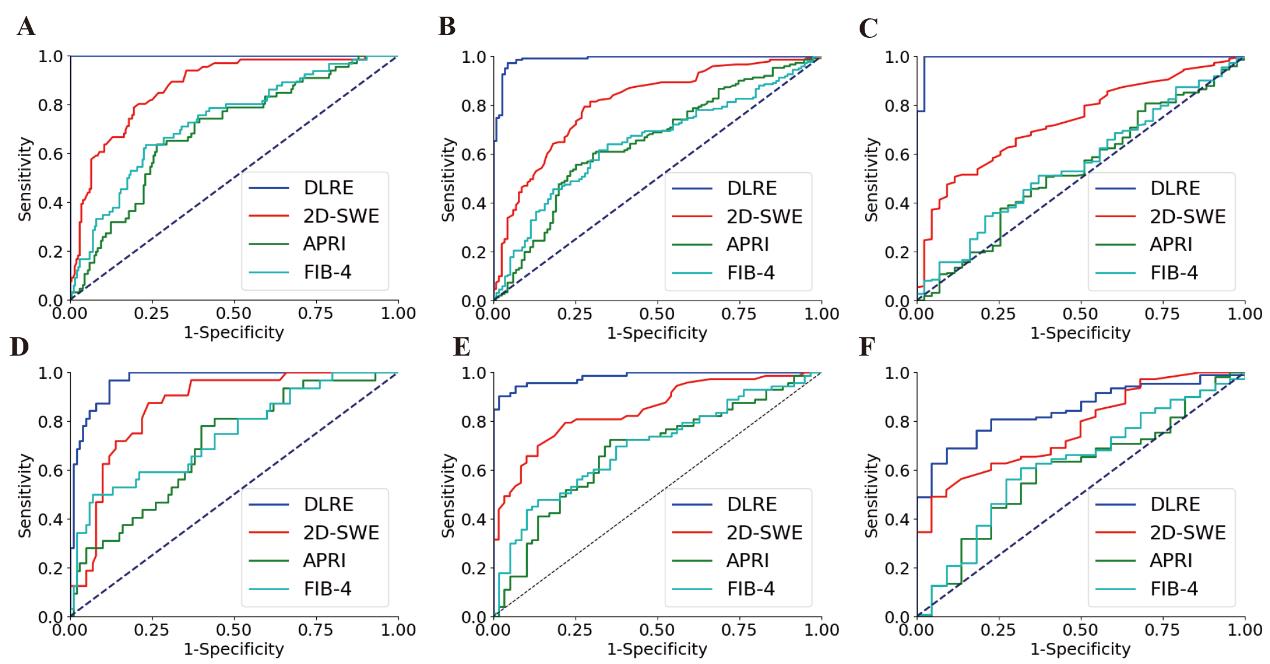 影像组学人工智能(DLRE)、超声弹性成像(2D-SWE)和血清学检测(APRI,FIB4)三种方法对于肝硬化(图A和D)、重度肝纤维化(图B和E)、显著肝纤维化(图C和F)分期诊断效能的ROC曲线对比 |