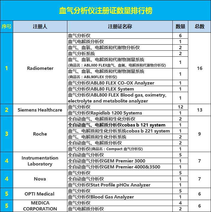 导读:中国血气市场是全世界最具有活力的市场之一,全球6%的平均增长率,而中国的增长接近20%。那么,在这个市场上,都有哪些玩家在拼杀竞争?麦科田医疗根据CFDA公开数据,整理了《血气分析仪注册证数量排行榜》,方便大家一览这个行业的主要玩家,供各位参考。 具体榜单如下: 1. 注册证拥有数前三甲分别为:雷度米特(16个)、西门子医疗(13个)、罗氏诊断(9个)。 2. 沃芬收购美国Instrumentation Laboratory后,仍以IL为注册人主体。 3. 从注册产品名称我们可以发现,随着技术的发展,血气、生化和电解质测定正逐步走向融合,越来越多的高端玩家在推出三者一体的分析仪产品。 4. 国产血气领域的代表企业,梅州康立和南京普朗是注册证数量最多的企业,其次是上海润达qixia的上海惠中。从市场反应来看,国产血气品牌在中国市场的占有率远低于国际品牌,实在令人惋惜! 5. 借着各种专科ICU的建设风潮,相信未来血气市场一定会朝着多元化、信息化的方向继续前行,会不会有更多优秀的国产企业异军突起,实现弯道超车?让我们拭目以待! |