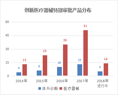 国家食品药品监督管理总局医疗器械技术审批中心依据《创新医疗器械特别审批程序(试行)》(食药监械管〔2014〕13号),对申请优先审批的医疗器械注册申请进行审核。诊断君根据CFDA和CMDE公示信息统计,自2014年3月1日办法实施以来,已纳入创新医疗器械特别审批产品共174个。
