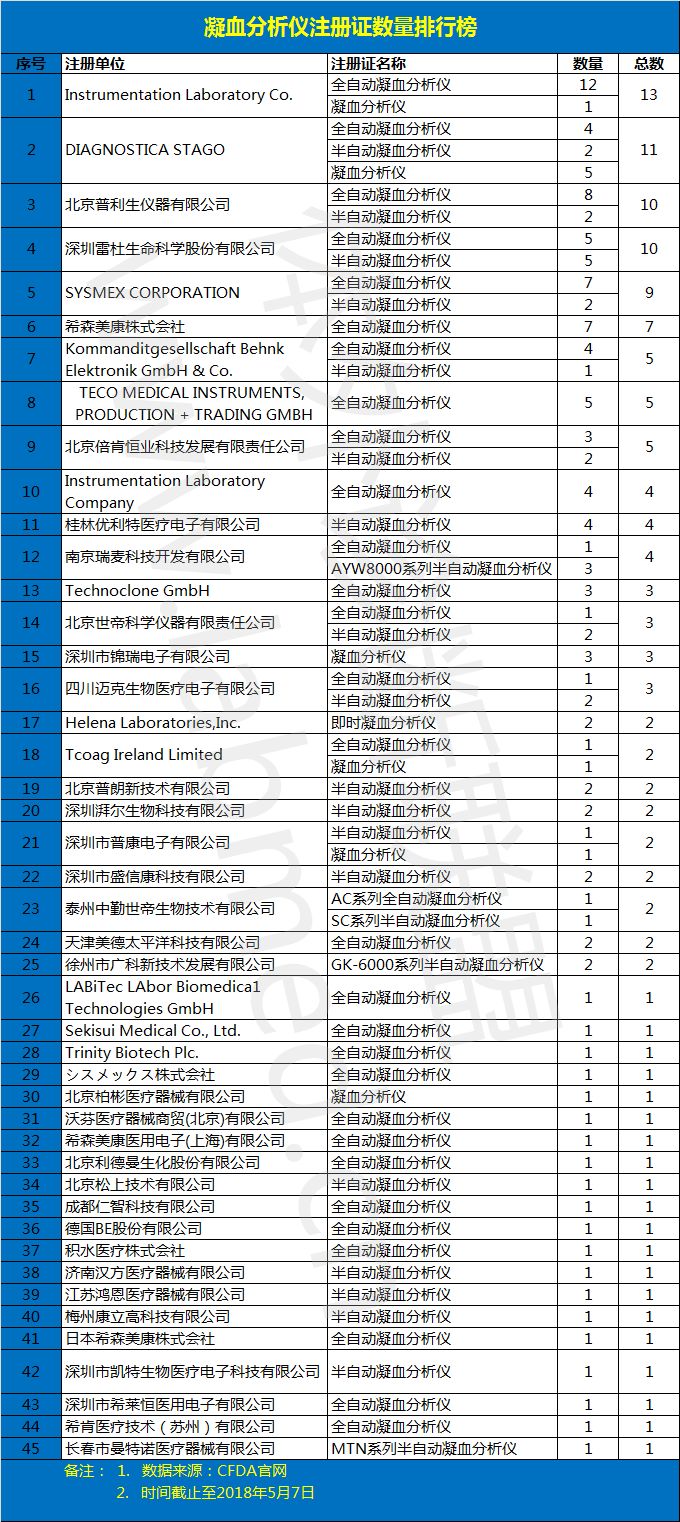 IVD联盟根据CFDA公开数据,整理了《凝血分析仪注册证数量排行榜》,供大家参考。