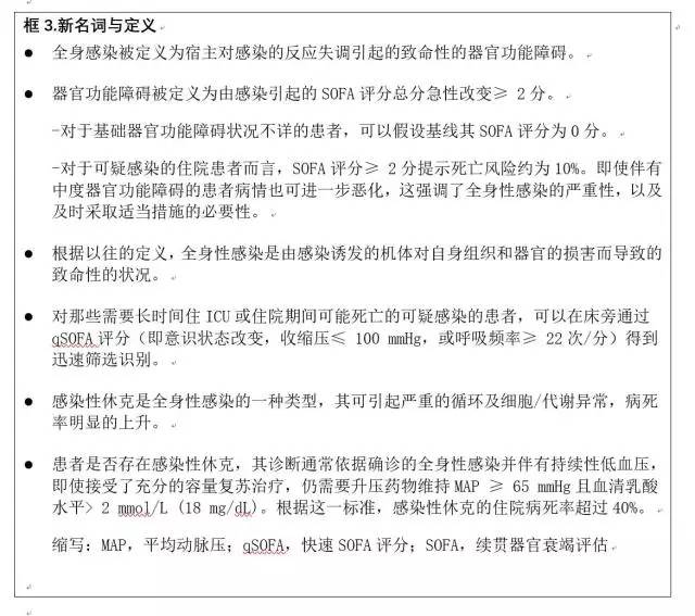 重要性:脓毒症与感染性休克的定义最后一次修订是在2001年。考虑到脓毒症病理学(器官功能、形态学、细胞生物学、生物化学、免疫学以及循环的变化)、管理以及流行病方面已经取得的进展,因此需要对该定义进行复审。目的:根据需要对脓毒症与感染性休克的定义进行更新和评估过程:危重病医学学会与欧洲重症监护医学学会召集19名脓毒症病理学、临床试验以及流行病学方面的专家组成工作组。脓毒症及感染性休克的定义与临床诊断标准通过会议、Delphi程序、电子健康记录数据库分析、以及投票产生,然后送至国际专业协会,要求(在致谢中列出的31个协会)同行进行评审与认可。以前的定义的局限性包括过度关注炎症反应、认为脓毒症遵循一个从严重脓毒症发展至休克的连续性误导模式、全身炎症反应综合征(SIRS)诊断标准的特异性与敏感性不足。目前已有多个术语用于脓毒症、感染性休克以及器官功能障碍的定义,导至在报告发生率与观察死亡率时出现差异。工作组得出结论:“严重脓毒症”这个术语是多余的。建议:脓毒症应该定义为感染引起的宿主反应失调所导至的致命性器官功能障碍。为了便于临床操作,器官功能障碍可以用序贯[全身感染相关]器官功能衰竭评分(SOFA)的增加大于等于2分来表示,其相关的住院死亡率大于10%。感染性休克应该被定义为脓毒症的一个类型,与单独的脓毒症相比,特别是在严重循环、分子、代谢异常方面与高死亡风险密切相关。在临床上感染性休克患者可通过下列情况加以识别:在排除低血容量的情况下,需应用升压药以维持平均动脉≥65mmHg,以及血清乳酸>2mmol/L(>18mg/dL)。感染性休克的患者在临床上可以通过下情况被识别:需要应用血管加压素保持平均动脉大于等于65mmHg,以及在没有低血容量情况下血乳酸大于2mmol/L(>18mg/dL)。根据这一联合标准,感染性休克的住院死亡率>40%。这个联合标准诊断的感染性休克患者相关的住院死亡率大于40%。在院外、急诊科或医院普通病房可疑感染的成人患者若符合至少2项临床标准[这一标准构成一新的床旁指标即快速SOFA(qSOFA):呼吸频率≥22次/分、意识状态改变、收缩压≤100mmHg],即可快速识别那些可能出现典型脓毒症不良预后的可疑感染的非ICU患者。在院外、急诊科以及医院普通病房,怀疑存在感染的成年患者,如果下面的临床诊断标准存在至少2条(这些诊断标准构成一个新的临床评分称作quickSOFA[qSOFA]:呼吸频率大于等于22次/min,意识改变,收缩压小于等于100mmHg),则作为更可能存在预后不良的典型脓毒症患者而被快速识别。结论和临床意义:这些更新的定义和临床诊断标准应该取代之前以前的定义,使流行病学研究和临床试验的结果与临床实际更加一致,便于快速识别和更及时地救治脓毒症患者或有可能进展为脓毒症风险的患者。脓毒症是一种由感染所导至的生理、病理和生物化学异常的综合征,是影响公众健康的重大问题。2011年来自美国的数据表明,超过200亿美元(美国医院临床费用的5.2%)用于了脓毒症的治疗。据报道脓毒症的发生率在持续增长,这可能反映了合并症较多的老年人口数量增加、更多的人认识到脓毒症的存在和一些国家的医保报销优惠政策等。尽管脓毒症真实的发病率仍然是未知数,保守的估计表明脓毒症是全球范围内患者死亡和危重疾病的一个主要病因。此外,人们越来越深刻的认识到存活的脓毒症患者往往会存在长期的生理、心理和认知障碍,带来巨大的医疗和社会问题。1991年的共识会议提出的脓毒症最初定义关注于当时流行的观点,认为脓毒症是由于感染引起宿主的全身炎症反应综合征(见方框1)。脓毒症合并器官功能障碍称为严重脓毒症,后者可以进展为感染性休克,感染性休克被定义为“由脓毒症所致,虽经充分液体复苏后仍无法逆转的持续低血压”。 2001年的工作组基于对这些定义的局限性的认识,拓展了诊断标准,但由于缺乏支持证据并未提出替代方案。实际上,脓毒症、感染性休克和器官功能障碍的定义在近20年中没有大的变化。由于对目前的定义需要重新审视,欧洲重症监护学会(ESICCM)和美国危重病医学会(SCCM)于2014年1月联合组成了一个包括重症监护室、感染科、外科和呼吸科专家在内的工作组。无用途限制的基金由两个学会提供,工作组保持了完全的自主性。两个学会各自任命了共同主席(Dr Deutschman和Singer),两位共同主席基于在脓毒症流行病学、临床试验和基础及应用研究上的科学专长选择工作组成员。工作组通过2014年1月到2015年1月之间举行的四次面对面会议、邮件往来和投票进行了反复讨论。工作组成员在基于对病理生理学认识的提高和可调用大型电子健康记录数据库及患者队列的前提下对脓毒症现行的定义进行了重新审视。基于目前对脓毒症所致的器官功能、形态学、细胞生物学、生物化学、免疫学和循环(总称病理生理学)的理解形成了脓毒症最新定义和诊断标准的专家共识,该诊断标准也将在临床中进行检验(内容效度)。下文也会对脓毒症的定义及不同诊断标准间的差异进行讨论。对潜在临床标准(建构效度)与该标准评价脓毒症预后(需要进入ICU进行治疗或死亡)能力(预测效度,一种标准效度)之间的一致性也进行了检测。工作组在多个大型电子健康记录数据库中进行了上述探索,这些数据库同时也解决了缺乏不同器