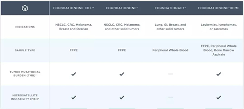 Foundation Medicine是一家致力于癌症护理的分子信息公司,通过深入了解导至每位患者癌症的基因组变化来寻求治疗方法。该公司提供了全套综合的基因组特征分析方法来鉴定癌症患者的分子改变,并将其与相关的靶向疗法、免疫疗法和临床试验相匹配。Foundation Medicine的分子信息平台旨在通过满足临床医生、学术研究人员和药物开发人员的需求,改善患者的日常护理,推进癌症分子医学。 FoundationOne CDx是基于下一代基因测序(NGS)的体外诊断设备,用于检测324个基因的变化,包括置换、插入和缺失改变(indels)、拷贝数改变(CNA),还有选择基因重排和包括MSI和从肿瘤组织标本分离DNA的TMB等基因特征(genomic signatures)。FoundationOne CDx已被FDA批准,用于罹患某些类型的非小细胞肺癌、黑色素瘤、结直肠癌、卵巢癌或乳腺癌患者。此外,FoundationOne CDx旨在提供肿瘤突变分析,供有资质的医疗保健专业人员根据肿瘤专业指南为恶性实体瘤患者提供指导。