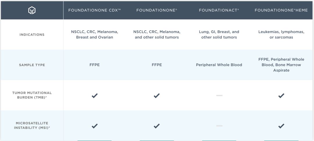 FoundationOne CDx是基于下一代基因测序(NGS)的体外诊断设备,用于检测324个基因的变化,包括置换、插入和缺失改变(indels)、拷贝数改变(CNA),还有选择基因重排和包括MSI和从肿瘤组织标本分离DNA的TMB等基因特征(genomic signatures)。FoundationOne CDx已被FDA批准,用于罹患某些类型的非小细胞肺癌、黑色素瘤、结直肠癌、卵巢癌或乳腺癌患者。此外,FoundationOne CDx旨在提供肿瘤突变分析,供有资质的医疗保健专业人员根据肿瘤专业指南为恶性实体瘤患者提供指导。