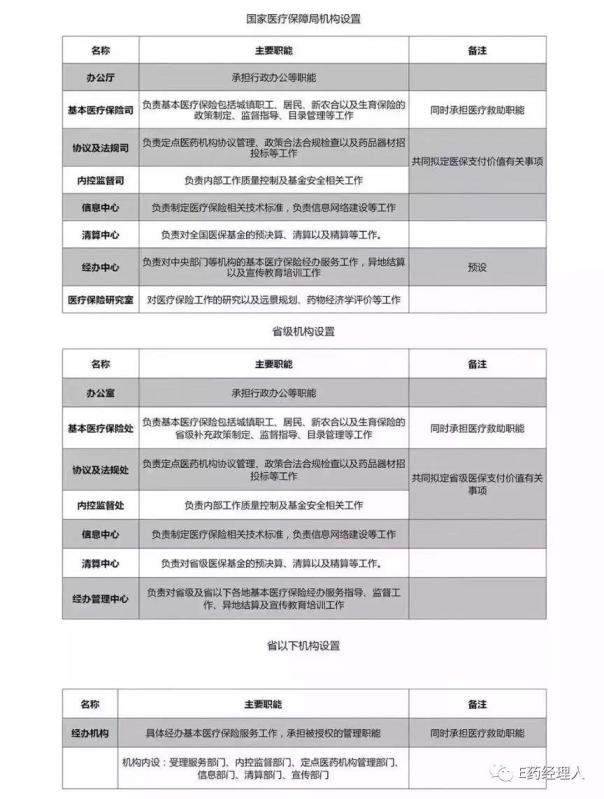 1.新任领导已确认! 目前已经确定,原国家财政部副部长胡静林将出任国家医疗保障局局长一职。 胡静林,男,汉族,1964年6月出生,安徽歙县人。1988年到1998年在国家国有资产管理局工作,先后任国家国有资产管理局政策法规司法规处副处长、政策法规司副司长、企业司副司长等职。1998年进入财政部工作,历任财产评估司司秘书、副司长、经济建设司副司长、经济建设司司长、财政部办公厅主任、财政部部长助理、财政部副部长等职。 三位副局长,则分别是国家发展和改革委员会副秘书长施子海、人社部医保司司长陈金甫,原国家卫生计生委基层司司长李滔。 施子海,男,汉族,浙江余姚人,1966年5月出生,中共党员。1991年7月毕业于北京师范大学,获经济学硕士学位。国家发展和改革委员会副秘书长。 施子海1991年进入国家计划委员会政策研究室,历任综合处主任科员、副处长、处长,一直到1999年进入国家发展和改革委员会,历任政策法规司综合处处长、政策研究室综合处处长,期间曾在河南新乡挂职一年,任市长助理、市政府党组成员。2006年1月之后,历任国家发展和改革委员会政策研究室副主任、价格司司长、国家发展和改革委员会副秘书长等职。 李滔,女,土家族,1967年11月出生,湖北恩施人,中共党员,教授,1990年7月参加工作,研究生学历,医学博士。 对于医药卫生领域,李滔无疑是极为熟悉的。李滔本身是眼科医生出身,在地方卫生系统与原国家卫计委都有过丰富的任职经验。在地方上,其先后担任武汉市卫生局办公室副主任、科技外事处副处长、妇幼保健与社区卫生处处长、副局长、局长等职务。在原国家卫计委,其先后担任卫生发展研究中心副主任、主任,国家卫生计生委基层卫生司司长。 在担任基层卫生司司长的近两年时间里,能够看到李滔经常到基层进行调研,根据网络公开资料,李滔此前的主要研究领域在于社会医学与卫生事业管理、社区卫生服务和基层医疗机构的改革与发展、农村卫生及农村合作医疗、公立医院改革及医联体建设、政府在卫生领域中的作用、卫生筹资、卫生总费用研究等。 此前在中国保险学会2016年学术年会上,当时还在任国家卫计委卫生发展研究中心的李滔就大病医保工作的开展还曾发表过专题演讲。李滔认为,大病保险工作离完善还有很大空间,要加强制度的衔接,就是保险医疗救助、民政救助、商业保险等等各个制度的衔接。大力发展商业健康险,建立多层次的医疗保障,鼓励商业保险与基本医保,参与基本医保的经办,加快发展医疗职业保险等等。 陈金甫,男,汉族,1962年8月生,江苏常州人,江苏南京大学经济学专业毕业,大学学历。长期从事医疗保险政策制定和研究工作。 对于业界来说,陈金甫已经是一个无比熟悉的名字。陈金甫最早在1997年就在原劳动保障部医疗保险司综合处任处长,此后又先后任原劳动保障部医疗保险司副司长、人力资源社会保障部医疗保险司副司长、司长,对于中国的医疗保险政策的制定与研究非常深入,尤其是近年来关于新版医保目录、医保支付标准、基本医疗保险支付方式改革等问题的研究,使得其理所当然的成为国家医疗保障局的理想人选。 2017年底,陈金甫还专门就“实施价值导向的医保战略性购买”撰文,其指出,当前中国医疗服务与医药市场呈现了快速发展和质量总体向好的态势,但也存在着总体供给不足和质量堪忧的现实,既有普遍的过度医疗和资源短缺,又有“神药”当道与好药难卖等怪象。无效的医疗无异会给医疗供给和医疗负担雪上加霜。 对此,陈金甫还专门明确了三条解决办法。第一,要旗帜鲜明地强调更高质量和具有价值的医保购买目标;第二,要用未来投资的战略思维强化医保购买的方向引领。要坚持问题导向,突破现有禁忌,着眼未来的改善,将当下的购买视同未来的战略投资;第三,要在医保集团购买中增强集聚资源效能,增强基金风险平衡能力。 2.机构设置如何? 根据E药经理获得讯息显示:医疗保障局下设8个组成部门,包括办公厅、基本医疗保险司、协议及法规司、内控监管司、信息中心、清算中心、经办中心以及医疗保险研究室。