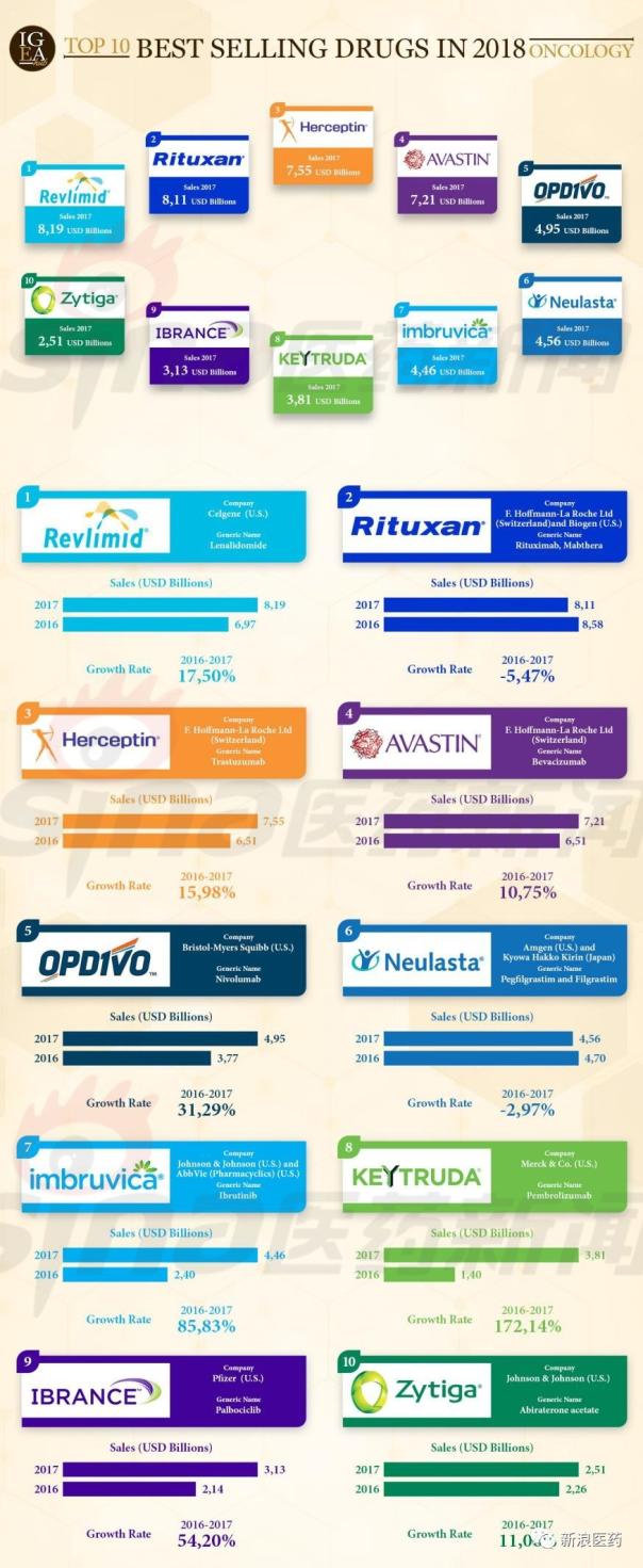 以下是Igeahub榜单中每个药物的销售情况。 1、Revlimid 公司:新基 2017全球销售额:81.9亿美元 较去年同期:增长17.5% 获批适应症:多发性骨髓瘤、骨髓增生异常综合征、套细胞淋巴瘤。 Revlimid是一种免疫调节剂,其活性药物成分为来那度胺,是沙利度胺的新一代衍生物,无致畸毒性,药效比沙利度胺强100倍,具有免疫调节、抗血管生成和抗肿瘤特性。 Revlimid是新基严重依赖的一款产品, 2017年总收入的贡献超过60%。EP Vantage近日发文分析了近5年来全球TOP20药企新药获批情况,新基排名垫底,只有3个新分子实体获批。不过,新基已经在采取多种措施力求减轻对Revlimid的依赖。例如,自今年开年以来,在并购市场连续出手,分别以70亿美元和90亿美元收购Impact和Juno,获得了一些非常有潜力的资产。 2、Rituxan 公司:罗氏 2017全球销售额:81.1亿美元 较去年同期:下降5.47% 获批适应症:非霍奇金淋巴瘤、慢性淋巴细胞白血病、类风湿性关节炎、肉芽肿血管炎和显微镜下多血管炎。 Rituxan是一种抗CD20单克隆抗体药物,其活性药物成分为rituximab,这是一种人鼠嵌合单抗,能与异常B淋巴细胞上的CD20抗原结合,通过补体依赖的细胞毒作用(CDC)和抗体依赖性细胞介导的细胞毒作用(ADCC)引发B细胞溶解的免疫反应,杀伤肿瘤细胞或B淋巴细胞。 今年4月,罗氏公布2018Q1报告,Rituxan报收17.13亿瑞士法郎,较去年同期下滑8%,这主要是由于欧洲市场的仿制药竞争所致。 3、Herceptin 公司:罗氏 2017全球销售额:75.5亿美元 较去年同期:增长15.98% 获批适应症:HER2阳性转移性乳腺癌、HER2阳性乳腺癌辅助治疗、HER2阳性转移性胃癌。 Herceptin是一种抗HER2单克隆抗体药物,其活性药物成分为trastuzumab,这是一种人源化单抗,能特异性地作用于人HER2蛋白的细胞外部分,抑制HER2阳性肿瘤细胞的增殖。此外,trastuzumab也是抗体依赖性细胞介导的ADCC的潜在介质。在体外研究中,trastuzumab介导的ADCC被证明在HER2过度表达的癌细胞中比HER2非过度表达的癌细胞中更优先产生。 Herceptin的活性药物成分为trastuzumab,在体外研究中,trastuzumab介导的ADCC被证明在HER2过度表达的癌细胞中比HER2非过度表达的癌细胞中更优先产生。 该药的销售增长,主要是受到了中国市场额外的报销审批以及美国市场与Perjeta联合用药时间延长的有利推动。 4、Avastin 公司:罗氏 2017全球销售额:72.1亿美元 较去年同期:增长10.75% 获批适应症:转移性结直肠癌、非鳞状非小细胞肺癌、胶质母细胞瘤、转移性肾癌、宫颈癌、复发型卵巢上皮癌、输卵管癌或原发性腹膜癌。 Avastin是一种血管生成抑制剂,其活性药物成分为bevacizumab,这是一种人源化单克隆抗体,可以选择性地与人血管内皮生长因子(VEGF)结合并阻断其生物活性。VEGF在整个肿瘤生命周期中发挥重要作用,帮助肿瘤发展、维持血管生成。Avastin可以直接结合VEGF,阻断其与血管细胞上受体的相互作用,从而干扰肿瘤的血液供应。而肿瘤血液供应被认为是肿瘤在体内生长和扩散能力的关键。 近年来,随着肺癌适应症的获批,该药在全球市场的销售持续走强,尤其是在中国市场。 5、Opdivo 公司:百时美施贵宝 2017全球销售额:49.5亿美元 较去年同期:增长31.29% 获批适应症:非小细胞肺癌、黑色素瘤、肾细胞癌、头颈部鳞状细胞癌、肝癌、膀胱癌、结直肠癌、霍奇金淋巴瘤。 Opdivo是一种PD-1肿瘤免疫疗法,其活性药物成分为nivolumab,这是一种单克隆抗体,靶向结合活化T细胞表面的负性免疫调节受体PD-1,抑制其与肿瘤表面配体PD-L1或PD-L2的相互作用,从而释放活化T细胞的免疫潜能,阻止肿瘤的免疫逃逸,恢复机体的抗肿瘤免疫应答。 Opdivo是当前全球最畅销的PD-1/PD-L1免疫疗法,不过EvaluatePharma近日发布的报告显示,得益于肺癌领域的空前成功,默沙东Keytruda很可能在今年第二季度首次超越Opdivo。 6、Neulasta 公司:安进&协和发酵麒麟 2017全球销售额:45.6亿美元 较去年同期:下降2.97% Neulasta是一种“升白”药物,用于提升患者体内的白细胞数量,其活性药物为培非格司亭,这是一种重组的人粒细胞巨噬细胞集落刺激因子(G-CSF)。G-CSF临床主要用于预防和治疗肿瘤放疗或化疗后引起的白细胞减少症、治疗骨髓造血机能障碍及骨髓增生异常综合征、预防白细胞减少可能潜在的感染并发症、以及使感染引起的中性粒细胞减少的恢复加快。肿瘤患者在放疗或化疗后,常会出现白细胞减少、抗感染能力降低等症状。因此,临床上常使用“升白药”提升患者体内的白细胞数量。 Neulasta是安进Neupogen的长效剂型,通过聚乙二醇(PEG)修饰延长了药物在体内的代谢时间,疗效更好。在美国市场,Neulasta核心专利已于2015年6月到期,预计将在2018年年中面临仿制药竞争威胁。 7、Imbruvica 公司:强生&艾伯维 2017全球销售额:44.6亿美元 较去年同期:增长85.83% 获批适应症:非霍奇金淋巴瘤、套细胞淋巴瘤、Waldenstrom巨球蛋白血症、边缘区淋巴瘤、慢性移植物抗宿主病。 Imbruvica是一种布鲁顿酪氨酸激酶(BTK)抑制剂,其活性药物成分为ibrutinib,通过抑制肿瘤细胞复制和转移所需的BTK发挥抗癌作用。BTK是B细胞受体信号复合物中的关键信号分子,在恶性B细胞的存活和传播及其它严重衰弱性疾病中发挥重要作用。Imbruvica能够阻断介导恶性B细胞不可控地增殖和扩散的信号通路,帮助杀死并降低癌细胞数量,延缓癌症的恶化。 近日,Imbruvica联合Gazyva一线治疗慢性淋巴性白血病或小淋巴细胞淋巴瘤I