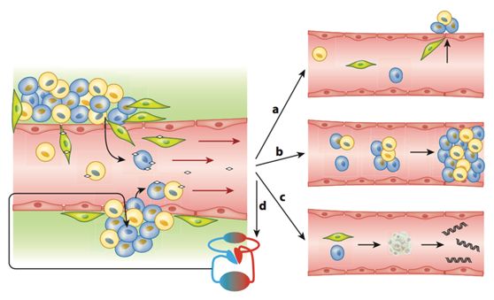 • 首先,为什么这群肿瘤细胞要跑到血液里面去?转移的路上布满荆棘,CTC进入血液后会受到多方面的阻力:血流的高速剪切力,由于细胞失去锚定而引发的失巢凋亡,免疫细胞的攻击等,这每一项对于CTC来说都是致命打击。那么,这是一次主动选择,还是其生命中的一次偶然事件?研究发现或许这两种情况都普遍存在。 • 关于主动选择假说:在巨噬细胞与生长因子的帮助下,CTC沿着胶原纤维骨架移动,最终移向血管。靠近血管之后,CTC要经历一次由内至外的变身来实现它入侵血管的计划,例如上皮类的蛋白表达增加,间质类的标志物表达下调等,这一系列的改变使得细胞骨架重新整合,细胞间的黏连性降低,侵袭性增强,促进肿瘤细胞进入血液中。 • 关于被动进入假说:如果说肿瘤是人类生命中不美丽的意外,那么,对于原本偏安一隅的肿瘤细胞来说,这群被其他细胞带入血液的CTC就是其生命中一次意外的跑偏。 • 那么,血液里的CTC一定会发生转移吗?It really depends. 这取决于他们进入血液后所经历的环境,以及其固有的转移能力。(a)对于极少数的CTC,能够通过血液完成它们的转移之旅;(b)还有一些CTC,它们走着走着遇到了另一群CTC,成群结队导至血栓;(c)再有一些CTC,很可能是意外进入血液,由于水土不服,引发了自身的凋亡;(d)当然,还有一小拨儿CTC,它们很神秘啊,在血液里转了一圈又回到了原发灶,完成了一次神奇的环球旅行(self-seeding)(图2)。