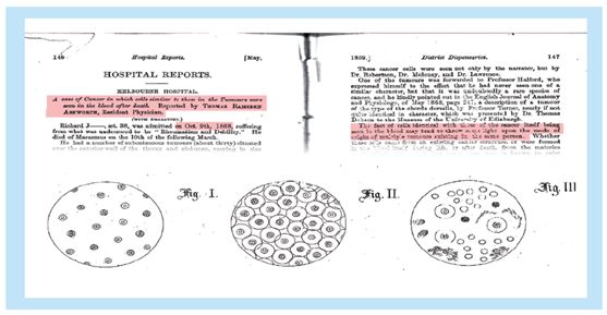 1. 第一个问题 “ 它是谁?” 1869年澳大利亚的病理学家 Thomas Ashworth 最早在转移癌症患者的血液中发现CTC现象(图1)。他在文中描述道“这些游离于血液里的细胞形态异常,跟实体肿瘤细胞很相似”。现代科学已经通过各种技术手段证实了Ashworth 的猜想,CTC是由原发灶的肿瘤脱落进入血液的细胞。 CTC的发现也颠覆了我们以往对肿瘤的认知,通常情况下肿瘤细胞都是在某个器官不断地繁衍增长。那么,什么肿瘤细胞会向血液里释放CTC呢? 图1 1869年Thomas Ashworth描述CTC现象的医学文献 2. 第二个问题 “ 它从哪里来? ” CTC在多种癌症中均有发现,凡是血管丰富的肿瘤组织都容易释放CTC。研究发现,不同类型的肿瘤释放CTC能力不同。在转移性乳腺癌中,CTC的检出率可以达到71%,结肠癌64%,直肠癌66%,卵巢癌60%,胃癌33%。 此外,癌症分期也与CTC释放相关。例如,在转移的乳腺癌中,70%的患者可以检测到CTC,而这个比例在早期的患者中却只有18%-30%。那么,肿瘤释放的CTC究竟发挥着什么作用呢? 3. 第三个问题 “ 它要到哪里去?” 伴随着癌症恶化过程,当原发灶环境已不适宜肿瘤细胞生长时,一些肿瘤细胞会通过多种途径找寻新的家园,其中,通过血液转移是最常见的方式。搭乘血液的快车,CTC在舒适的车站下车,从血液进入新的器官,实现肿瘤的转移。 ![]() 关于CTC的2个进阶问题: