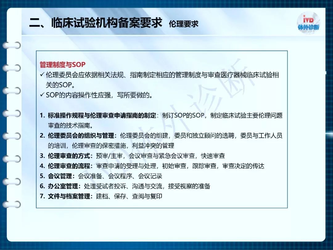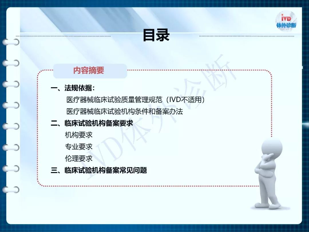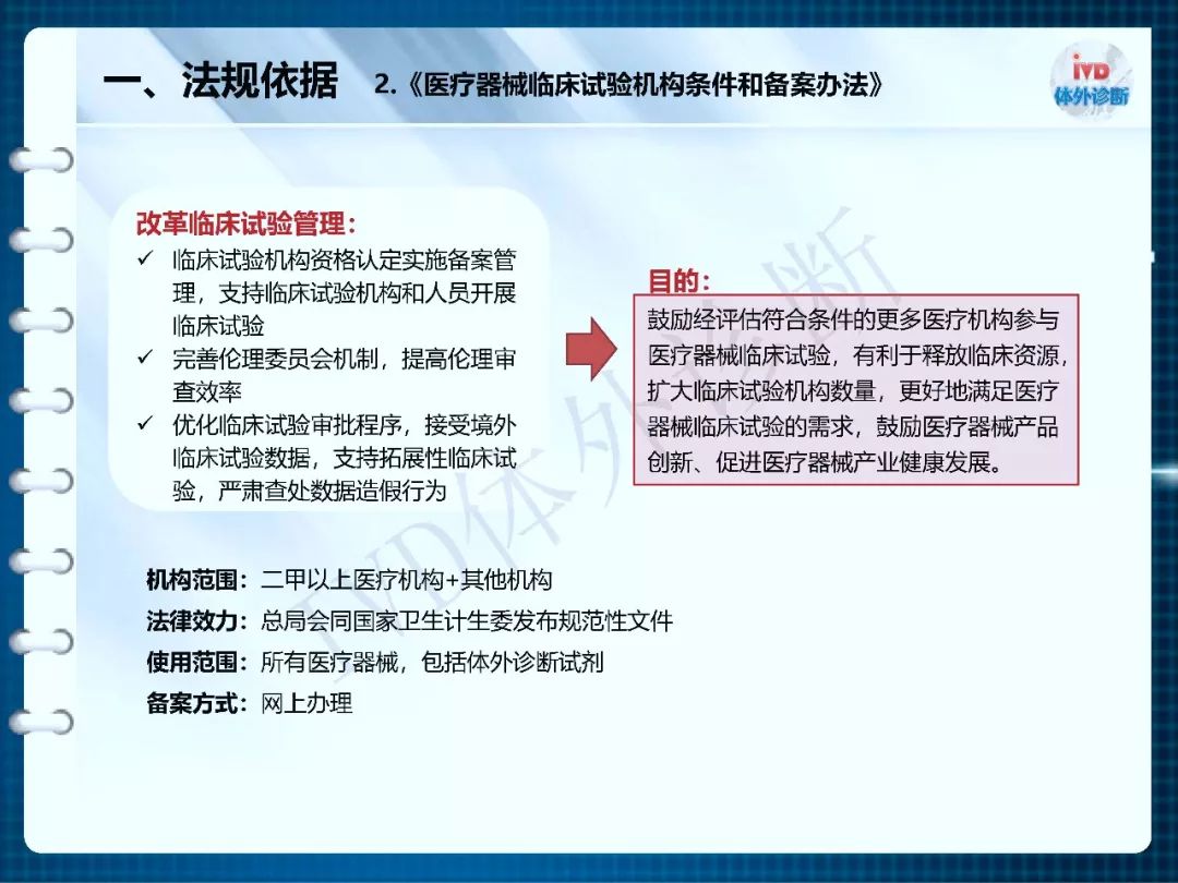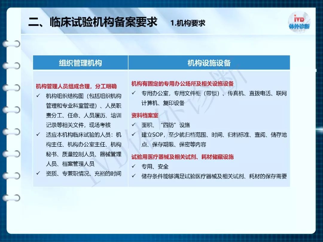 《备案办法》分为总则、备案条件、备案程序、监督管理和附则五章共二十条。 总体要求,明确了目的、定义和适用范围,适用于在我国境内开展医疗器械临床试验的临床试验机构备案。 备案条件,明确了医疗机构备案应当具备的条件等相关要求;为了加强对高风险医疗器械管理,保证受试者安全和提高临床试验质量,规定对列入需进行临床试验审批目录的第三类产品,应当在三级甲等医疗机构专业范围内开展临床试验;规定开展创新医疗器械产品或需进行临床试验审批的第三类医疗器械产品临床试验的主要研究者应具有高级技术职称并且参加过3个以上医疗器械或药物临床试验等等。 备案程序,由食品药品监管总局组织建立医疗器械临床试验机构备案管理信息系统(以下简称备案系统);医疗器械临床试验机构办理备案获得备案号后可以承担医疗器械临床试验。 监督管理,明确了省级以上食品药品监管部门和卫生计生行政部门按照分工负责组织开展对临床试验机构的监督管理和信息沟通等职责。