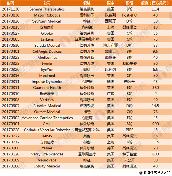 从全球医疗器械融资的区域分析,2017年,美国获得融资有16起,占比59.3%;中国有3起,占比11.1%,分别是上海的方润医疗、安翰医疗以及广东的瑞光康泰。由此可见,美国成为医疗器械行业的投资聚集地,这与全球医疗器械行业的市场规模的分布不谋而合,医疗器械行业的龙头企业大部分都聚集在美国,核心技术仍然是行业发展之本。