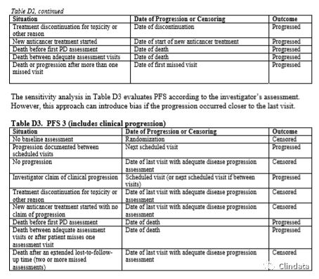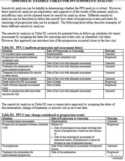 敏感性分析有助于确定PFS分析是否稳健。然而,这些敏感性分析是探索性分析,且支持主要分析结果,而且只根据敏感性分析可能无法确定疗效。表格中描述了不同的敏感性分析,规定如何分配进展事件日期和进展数据删失日期。下列三个表格描述了三种不同敏感性分析的示例。表D1中的敏感性分析通过分配审查日期和只在计划访视日期分析的事件校正肿瘤评估随访计划中的潜在偏倚。然而,如果在接近末次访视时出现进展,则该方法可能引入偏倚。