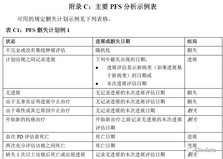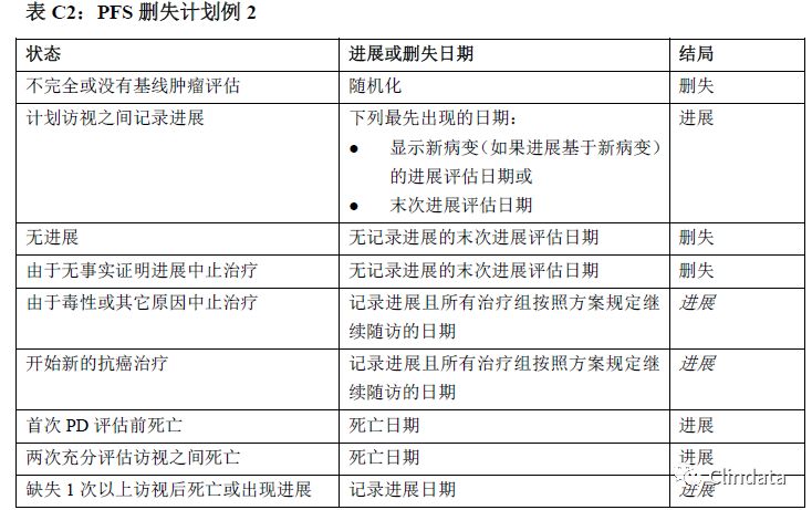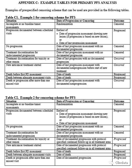 ● 删失日期定义。删失日期针对在数据截止或脱落之前没有记录进展的患者。在这些患者中,删失日期通常定义为最后一次充分评估进展状态的日期。也可使用末次评估日期。然而,在确定进展时可以评价多种放射学检测。另外,也可采用与这些放射学评估相对应的临床访视日期。