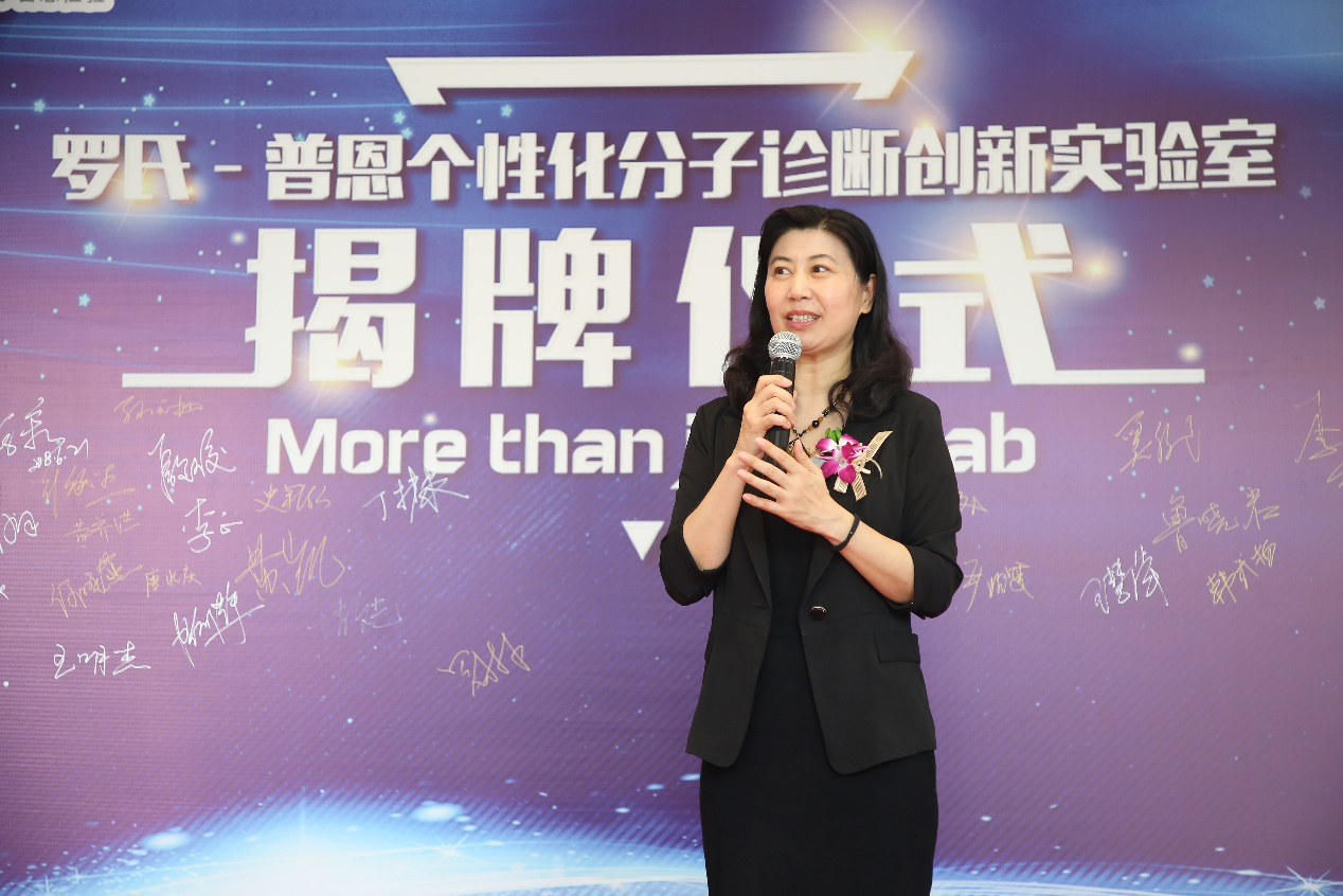 罗氏诊断分子解决方案-生命科学和组织诊断事业部总监苏忠美女士 罗氏-普恩个性化分子诊断创新实验室的成立得到了上海临港松江科技城投资发展有限公司的大力支持,公司董事长丁桂康先生对于行业内巨头罗氏诊断与医疗诊断界新锐普恩检验的此次合作寄予了极高的评价及厚望;作为罗氏诊断AVENIO ctDNA检测项目科研合作医院的负责人之一,复旦大学附属中山医院肝外科副主任、复旦大学肝癌研究所办公室主任史颖泓教授应邀出席揭牌仪式,并代表临床医生和患者道出了对于临床诊断先进理念和最新检测技术的迫切需求;罗氏诊断分子解决方案-生命科学和组织诊断事业部总监苏忠美女士则表达了罗氏诊断持续引领行业步伐,致力于推进AVENIO肿瘤基因检测创新项目本土化的决心和信心;最后,普恩检验母公司——顿慧医疗的创始人兼总经理温冬女士总结道:“今天,罗氏-普恩个性化分子诊断创新实验室的成立仅仅是一个起点,‘More Than Just a Lab’将无时无刻不提醒着我们这项事业所承载的人类健康的梦想和使命。”