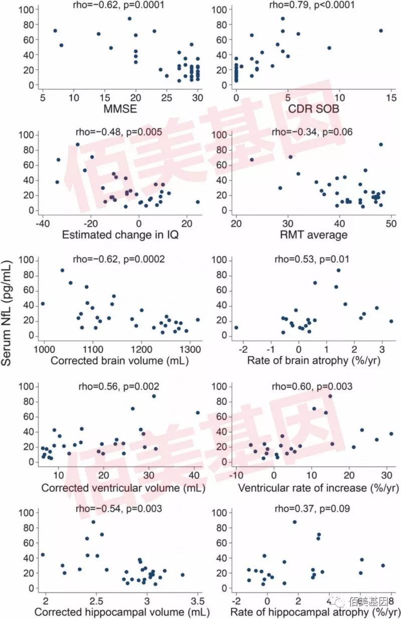 阿尔茨海默病(AD) 阿尔茨海默病(AD)是一种以智力缓慢丧失为特征的神经退行性疾病, 以记忆障碍、失语、失用、失认、视空间技能损害、执行功能障碍以及人格和行为改变等全面性痴呆表现为特征。其主要病理特征之一为神经细胞内出现大量神经纤维缠结。 我国现阶段有阿尔茨海默病患者约500万,到2020年我国患病人数将超过600万,我国65岁以上老年人群中每5个人里就有1个人有轻度认知障碍。阿尔茨海默病已成为全球老年人群中严重威胁的疾病。治疗阿尔茨海默病的关键在于早发现,阿尔茨海默病发病较为隐匿,很难察觉。往往患者从出现症状到首次确诊平均需要大于一年的时间,往往已经错过最佳的治疗时机。因此,在老年人群中,做好尽早筛查和诊断,采取干预措施,能够最大程度的赢取宝贵的治疗时间。 目前研究中,人们对其病因了解仍不透彻,尤其收集脑组织样本存在困难。临床诊断主要依赖于对认知水平的测试及对脑脊液中t-tau蛋白、p-tau蛋白、Aβ42、NfL相关蛋白的分析。虽然这些标志物在疾病的早期诊断上提供了高敏感性和特异性的方法,但它们收集困难,不适用于对疾病进程的跟踪。 超灵敏Simoa技术检测血清NFL以评估阿尔茨海默病 近期,伦敦和瑞典的科学家通过超灵敏Simoa技术,对家族性阿尔茨海默病进行研究,发现血清中NfL在症状出现之前升高,且与疾病分期和严重程度相关,暗示血清NfL可作为阿尔茨海默病早期神经退化的标志物,文章为《Serum neurofilament light in familial Alzheimer disease-A marker of early neurodegeneration》,发表在神经科学杂志Neurology上。 样本类型 选取有PSEN1或者APP突变的家族史的48人,其中18人为阿尔茨海默病患者,30人是未出现症状,携带突变的风险50%。所有参与者用sanger测序检测是否为携带突变。 选取有PSEN1或者APP突变的家族史的48人,其中18人为阿尔茨海默病患者,30人是未出现症状,携带突变的风险50%。所有参与者用sanger测序检测是否为携带突变。 研究方法 使用Simoa超灵敏免疫分析法,对血清NfL浓度进行定量分析。认知测试和核磁共振成像(MRI),并计算萎缩率。利用广义最小二乘回归模型比较症状突变携带者、症状前携带者和非携带者之间的血清NfL水平,并根据年龄和性别进行调整。Spearman系数来评估血清NfL与症状发作的估算年数(EYO)、认知测量、萎缩的MRI测量之间的关联。 1 测量者年龄、性别、认知测试、成像测量和NfL浓度等统计。 2 非突变携带者、症状前突变携带者、出现症状者,三组血清NfL水平。 3 在所有突变携带者中,血清NfL与EYO (r=0.81, p<0.0001 )显著相关,处于较晚疾病分期的具有较高的NfL浓度。圆点是突变携带者,叉号是非携带者。 4 在所有突变携带者中,血清NfL与多种认知和成像检测(MRI)相关,包括微型精神状态检查量表(Mini-Mental State Examination, MMSE) (r=-0.62, p=0.0001 )、临床痴呆评定量表(Clinical Dementia Rating Scale sum of boxes, CDR SOB)( r=0.79, p<0.0001 )、基线脑体积(baseline brain volume )(r=-0.62, p=0.0002 )和全脑萎缩率(whole-brain atrophy rate)(r=0.53, p=0.01 ),说明血清NfL可能与疾病严重程度或疾病进展相关。 5 生物标记与症状发作的估算年数(EYO)症状前相关性。 在症状出现之前,阿尔茨海默病中血清NfL浓度增加,且与疾病分期和严重程度相关,因此血清NfL可作为早期阿尔茨海默病相关神经退化的生物标记物。已有研究使用该技术测定了健康对照组和患者的血清NfL水平,结果显示,血清和脑脊液中的NfL水平存在显著相关性,提示血液采样可以代替脑脊液检测。 Simoa检测法与酶联免疫吸附试验(ELISA)和基于电化学发光法的试验相比,对NfL检出的敏感性分别高出126倍和25倍。既往只能在脑脊液中检测的神经标志物,利用Simoa技术可以在外周血中检测到,这改变了脑损伤和神经退行性疾病的诊断方式。 佰美基因联合美国Quanterix公司成立中国合作研究中心,将利用超灵敏免疫分析技术,在肿瘤早期检测、传染性疾病、心血管疾病、免疫炎症、神经系统疾病的新型生物标志物发现及血液筛查等方面,加大与临床多方合作,推动检验技术进步,助力精准医疗的发展。 [1].Philip S.J. Weston, Teresa Poole, Natalie S. Ryan, et al. Serum neurofilament light in familial Alzheimer disease A marker of early neurodegeneration. Neurology. 2017,89:2167–2175. [2].Nakamura A, Kaneko N, Villemagne VL, et al. High performance plasma amyloid-β biomarkers for Alzheimer's disease. Nature, 2018, 554(7691):249. |