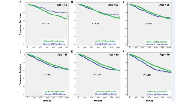 图2 50岁以上和50岁以下的II-III期直肠癌患者中,接受NCCN指南方案和未接受NCCN指南方案的中位生存时间 如图2所示,在II-III期、50-75岁的患者的预后中,NCCN指南中建议方案明显优于其他方案。 不过,对于小于50岁的患者,尽管分期及分化程度要差于老年患者,但NCCN指南建议方案并没有明显优于其他“简化”方案(无辅助放疗、新辅助化疗或放化疗)! 小于45岁患者中,NCCN指南获益劣于其他方案