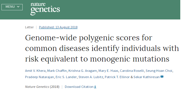 “我们早就知道,仅仅根据他们的总体遗传变异就能知道一些高风险人群。”通讯作者、Broad Institute心血管疾病倡议主任兼哈佛医学院医学教授Sekar Kathiresan说, “现在,我们能够使用基因组数据以有意义的方式来测量这种风险。从公共卫生的角度来看,我们需要确定这些高危人群,以便我们能够提供适当的护理。” 具体研究 为了开发疾病风险评分算法,研究人员首先从大规模全基因组关联研究中收集数据,以确定与冠状动脉疾病、心房颤动、2型糖尿病、炎症性肠病或乳腺癌相关的基因变异。对于每种疾病,他们应用一种计算算法将来自所有变异体的信息(其中大部分变异体单独对风险的影响非常小)组合成一个单一的数字,即多基因风险评分。这个数字可以用来根据一个人的基因组预测他(她)的患病几率。 为了验证该算法,研究小组对来自英国生物银行(UK Biobank)的40多万人的数据进行了测试,该银行是一个广泛的数据库,收集了来自英国血统参与者的基因组数据和医学信息。 需要强调的是,根据Khera的说法,冠状动脉疾病的多基因风险评分高的人不一定表现出其他疾病风险的警告信号(如高血压或高胆固醇)。 他解释说: “这些人的心脏病发作的风险是正常水平的几倍,而这仅仅是由于多种基因变体的附加效应。一旦他们进入临床实践中,常规标准就无法判断他们的风险值。只有对这些病例进行确认,我们才能更有效地进行筛查和治疗,而新算法为我们提供了一种潜在的前进道路。”