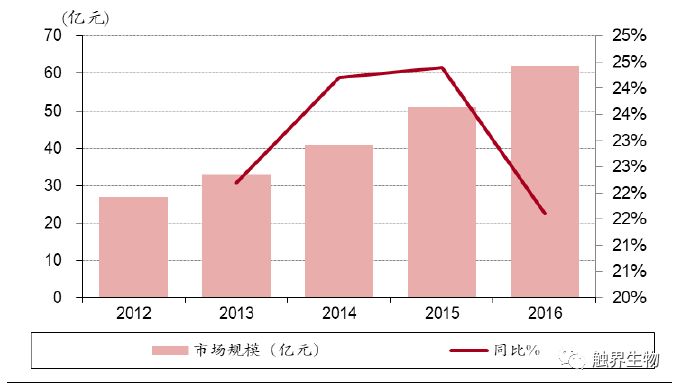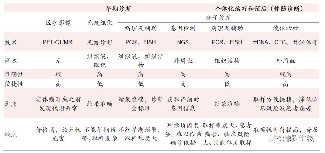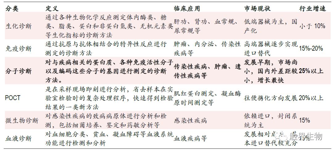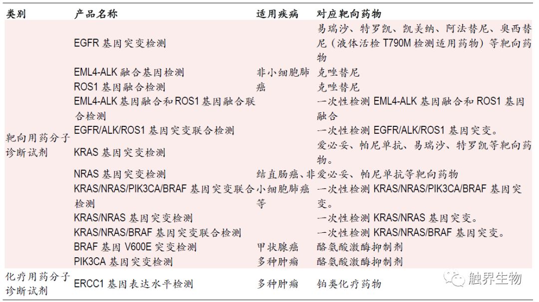 1 精准医疗新方向,分子诊断成为新蓝海 产业政策支持精准医疗及分子诊断发展,国内行业复合增速达到20%以上 国家产业政策大力支持分子诊断行业发展,并鼓励使用国产医疗器械加速进口替代进程。2015年7月,卫计委个体化医学检测技术专家委员会制订了《肿瘤个体化治疗检测技术指南(试行)》和《药物代谢酶和药物作用靶点基因检测技术指南(试行)》,要求实现肿瘤精准医疗用药基因检测标准化和规范化,这使得伴随诊断产品的获批时间延长,但是行业门槛也相应提高。2016年“精准医学研究”被国务院列为优先启动的重点专项之一。2015年发改委发布《关于实施新兴产业重大工程包的通知》提到,要重点发展基因检测等新型医疗技术,并将在3年内建设30个基因检测技术应用示范中心,快速推进基因检测临床应用以及基因检测仪器试剂的国产化。另外2018年5月1日起,进口的全部抗肿瘤药实现零关税,且原研抗肿瘤药的审批进口流程简化,并将加速纳入医保目录,这将大幅提高伴随诊断类试剂的需求量。 2016年全球分子诊断行业规模达64亿美元(占整个IVD市场的10.4%左右),近5年复合增长率约11%(IVD市场的平均增速为5%);国内分子诊断市场规模超过62亿元人民币,近5年复合增长率约23%(我国IVD市场增速为15%左右)。2016年中国人均分子诊断费用(分子诊断市场规模/人口数)约0.7美元,而欧美发达国家人均分子诊断费用普遍超过3-3.5 美元。以非小细胞肺癌(NSCLC)为例,2011版NCCN指南推荐所有NSCLC患者进行EGFR基因突变检测(目前美国普及率达到80%),这一检测比例在我国较低,以吉林省肿瘤医院的研究数据表明,我国北方地区 IIIB/IV 期 NSCLC 患者 EGFR 基因突变检测比例为 42.54%。 图表1. 全球分子诊断市场规模及增速 图表2. 我国分子诊断市场规模及增速 受遗传、环境因素、人口老龄化和人均寿命提高的影响,我国肿瘤患病人数逐年增高。根据全国肿瘤登记中心数据,中国2015年新增约429.2万癌症病例,2016年我国恶性肿瘤出院人数达300万人,同比增长16%。肿瘤病死率逐年下降,2016年我国肿瘤病死率下降至1.86%。出院人数的增加和病死率的下降意味着肿瘤发病率和存活率的提高,预示着分子诊断更为广阔的应用前景和市场空间。 分子诊断各类技术中PCR是目前应用最成熟、市场份额最大的平台 体外诊断包括生化诊断、免疫诊断、分子诊断、POCT(即时诊断)、微生物诊断及血液诊断等。其中生化诊断市场规模最大,分子诊断增速最高。我国体外诊断行业相比欧美国家起步晚,产业化发展相对滞后,然而在分子诊断行业,虽然起步较晚,但技术起点高且相对成熟,可比肩国际领先水平。 图表3. 体外诊断各细分行业概览,其中分子诊断增速最高 分子诊断主要是指编码与疾病相关的各种结构蛋白、酶、抗原抗体、免疫活性分子基因的检测。分子诊断常用技术包括聚合酶链式反应(PCR),荧光原位杂交(FISH),下一代基因测序(NGS)和基因芯片。目前PCR市场份额最多,应用最成熟;NGS是复合增速最高的技术平台。 从临床诊断应用的角度,检测的目标位点必须具有明确的临床价值,因此相对于NGS技术而言,PCR技术的简便性、稳定性和使用的广泛程度意味着在未来一段时间内PCR技术依然是核酸突变位点检测的不二选择。 图表4. 分子诊断各细分技术平台优缺点及应用 PCR平台中实时荧光定量PCR是目前最成熟和临床应用最多的技术 PCR技术是目前应用最成熟、占市场份额最大的分子诊断技术,约占分子诊断市场的67%。其中实时荧光定量PCR(RT-PCR)市场份额最大,但数字PCR的增长最快,增长率约12.2%。从全球市场来看,试剂耗材金额占比最大,检测服务增长率最高。 2 伴随诊断是肿瘤分子诊断试剂放量的必然路径 分子诊断应用于肿瘤早诊、治疗、预后全过程 随着精准医学进入肿瘤医学,分子诊断会使肿瘤患者从个性化诊疗中最大程度地获益,分子诊断可以应用于肿瘤早诊、治疗和预后全过程。在早期诊断上,病理诊断是肿瘤诊断的金标准,其中分子诊断用于病理诊断的分子分型。在个体化治疗和预后阶段,分子诊断能够提供针对特定治疗药物的治疗反应信息,有助于确定能够从某一治疗产品中获益的患者群体,从而改善治疗预后并降低医疗开支。 图表5. 分子诊断贯穿肿瘤诊疗全过程,病理准确度最高,液体活检最便捷 分子诊断多用于基因分型和伴随诊断,临床应用中疗效预测准确性比灵敏度更重要 以非小细胞肺癌为例,分子诊断多应用于肿瘤基因分型和伴随诊断。NSCLC约占全部肺癌的80%左右,绝大多数非小细胞肺癌存在驱动基因的改变。非小细胞肺癌治疗中涉及分子诊断的环节包括基因突变分子分型和耐药性检验。相关基因突变主要有EGFR突变、ALK基因融合/重排、ROS1、HER2等。临床上EGFR基因突变的检测方法包括标准测序法、扩增阻滞突变系统(ARMS)以及实时荧光PCR等,按照样本来源可以分为组织活检和液体活检。在EGFR靶向治疗上,19、21外显子突变约占EGFR突变的90%(药敏突变),一线标准治疗采用一代EGFR-TKI(埃克替尼、吉非替尼、厄洛替尼)等,少见位点有20位点的T790M突变,是EGFR敏感突变患者产生获得性耐药的主要原因之一,三代EGFR-TKI(奥西替尼)是其靶向药。 图表6. 对非小细胞肺癌患者通过基因分型选择合适的治疗药物 目前对于已知的预设位点基因突变,检测的主流技术是PCR,常见的是罗氏的Cobas平台和ARMS平台。Cobas、ARM