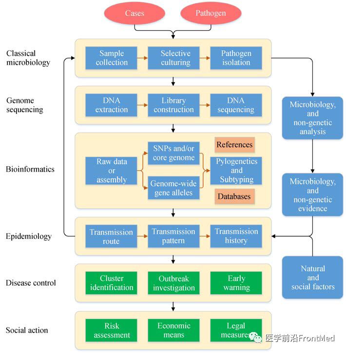 导读 在过去的十年里,借助基因组测序和数据分析技术的快速发展,使得细菌全基因组测序在常规监测实验室均可实现,也催生了细菌性传染病领域一个新的学科——基因组流行病学,以深入分析和解决传统流行病学和实验室手段不能解决的问题。中国疾病预防控制中心传染病预防控制所、传染病预防控制国家重点实验室徐建国院士、阚飙研究员团队于2018年1月9日在Frontiers of Medicine发表题为《全基因组测序改变细菌性传染病监测和调查模式》(Transforming bacterial disease surveillance and investigation using whole-genome sequence to probe the trace)的综述文章,阐述全基因组分型溯源技术在细菌性传染病监测和调查中的应用,提出病原细菌全基因组测序技术及其网络化和信息化的布局正在转变细菌性传染病的监测预警模式。 为了读者能快捷全面地了解相关科研进展,作者团队对这一综述做了翻译精编,内容全面,细节详实。全文2398字,读后有收获,有启发。点击篇末“阅读原文”,可阅读和下载英文综述全文。 导言 自从利用新的测序策略获得第一株细菌全基因组,至今已过去二十年,这期间,基因组测序和信息分析技术仍展现出了快速的发展,测序方法和序列读长都在迅速改善,原始测序与组装质量、序列数据挖掘分析策略和算法不断优化。通过微生物基因组序列比对分析,能够准确获得变异特征,这些序列变异特征可作为识别不同亚型的生物标记,并据此分析不同菌株间的遗传变异关系,为数字化重构菌株间的流行病学关联程度建立了分子基础。基因组信息在传染病监测和暴发调查研究中的应用可被定义为:根据基因组信息分析病原菌分离株之间的分子流行病学关系,结合社会信息、自然与地理信息等,重构传播链,协助分析解释传染病的发生和扩散,对疫情进行溯源,进而明确传染病的发生模式(图1)。目前分离株基因组比对主要有两种方法,分别是基于序列的全基因组/核心基因组单核苷酸多态性(SNP)、基于来自全基因组/核心基因组的多位点序列分型(MLST)。利用病原细菌分离株的基因组序列,可在下述几个方面发挥作用。 图1 细菌性传染病暴发调查和监测分析中基因组流行病学研究的一般流程。