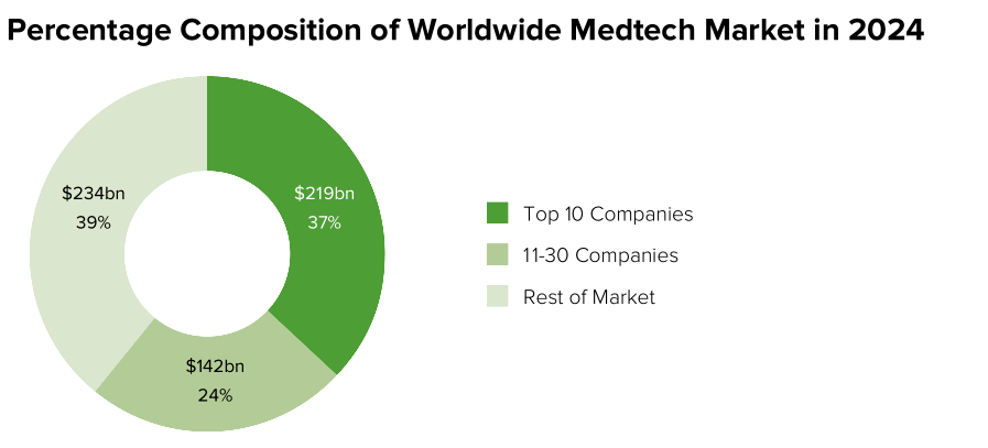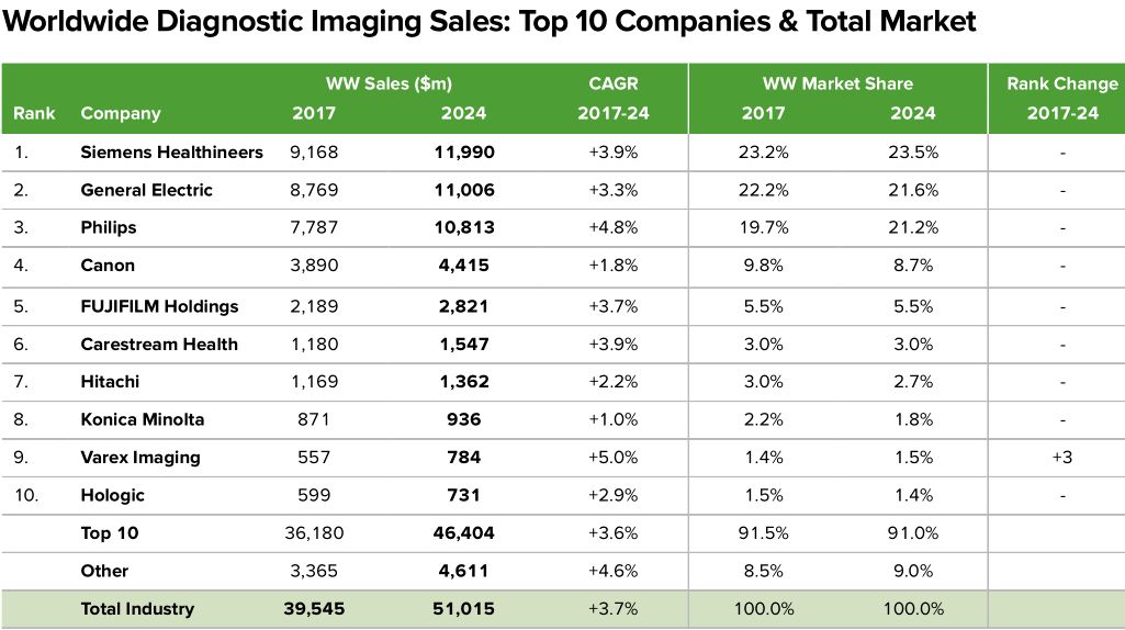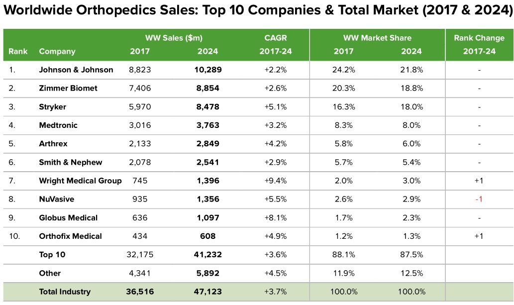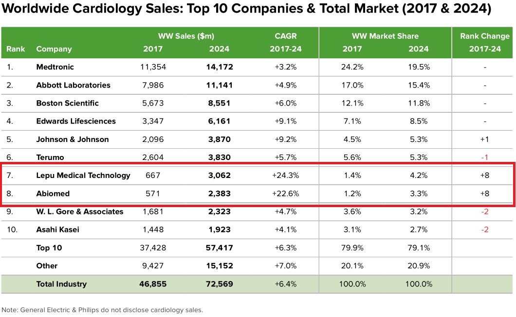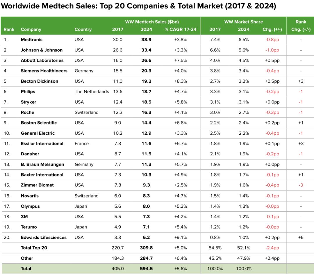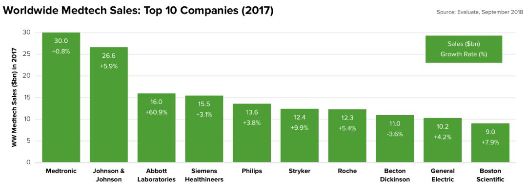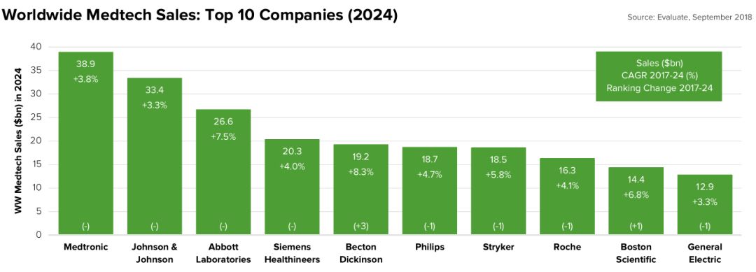 2017年器械王者美敦力营收300亿美元,2024年仍然独占鳌头,预测营收389亿美元。