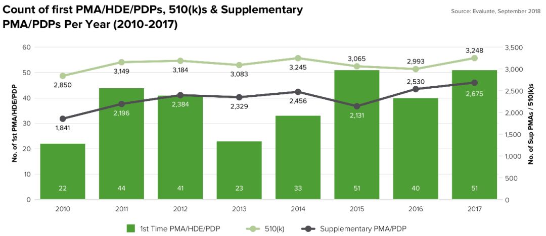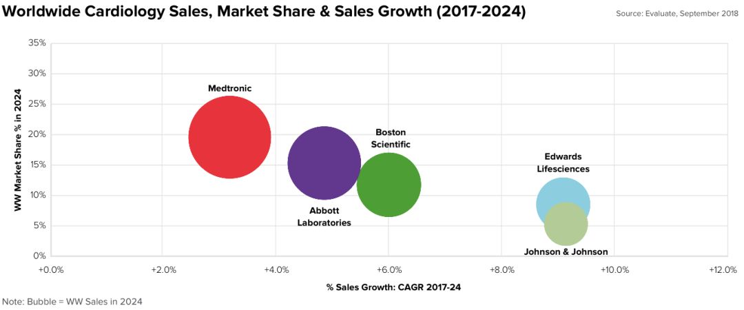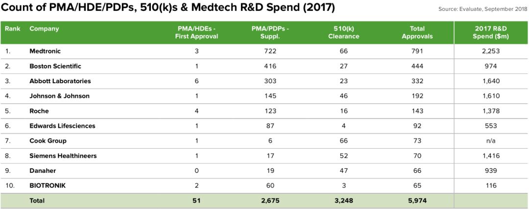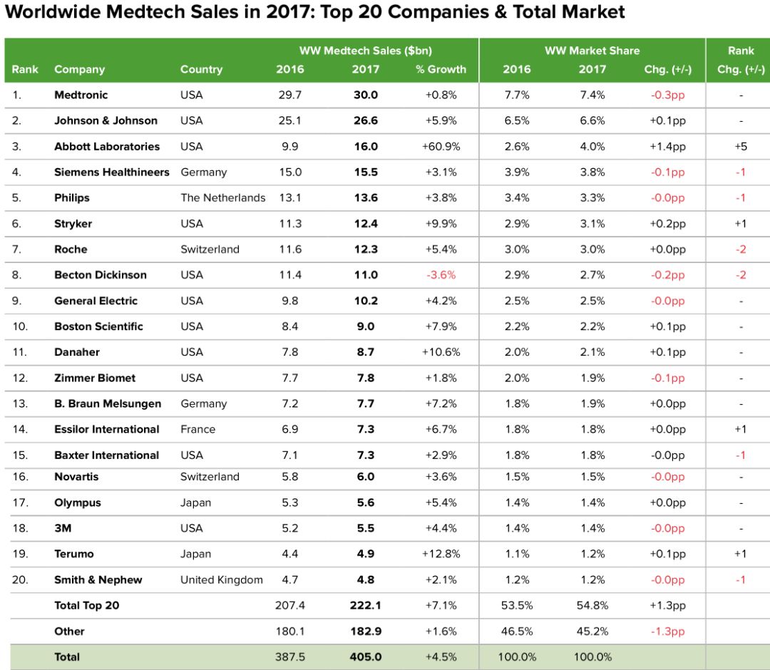 2024年前十大器械领域,市场容量和年均增速 (2017-2024) 与2017年的报告相比,2018年的报告中,预计到2024年,糖尿病护理器械的市场规模将大于伤口护理产品,所以在图中增加了糖尿病护理一项,而删除了伤口护理产品一项。 2024年前十五大器械领域,市场容量和年均增速 (2017-2024) 在2018版的报告中,糖尿病护理产品排名上升,星哥推测这是2017年雅培和德康的连续动态血糖监测的持续增长让EvaluateMedTech做出了一些改变。 而神经学器械的排名上升,相信得益于过去一年人工智能领域在全球的火爆。 2017年全球医疗器械领域营收前十的公司 2017年器械王者美敦力营收300亿美元,市场占有率7.4%; 雅培营收大涨60.9%,主要是收购圣犹达,业绩并表; BD是前二十强中,2016-2017年唯一营收下滑的公司,主要是由于剥离了呼吸科相关产品。 2017年全球医疗器械领域营收前二十的公司及其市占率 2017年全球器械领域市占率分布 全球医疗器械行业营收排名前十位公司(2024) 全球医疗器械行业营收排名前二十位公司及其市占率 (2017-2024) 2024年器械王者美敦力营收预计389亿美元,市占率6.5%; 得益于收购圣犹达和美艾利尔,雅培将位列探花,2014年营收预计超过260亿美元; 2017年BD排名第八,由于收购巴德带来的业绩强劲增长,BD在2024年有可能位列器械行业第五。 2024年全球器械领域市占率分布 全球医疗器械行业研发投入 (表1:2011-2024) 全球医疗器械行业研发投入 (表2:2011-2024) 2024年全球医疗器械行业预计在研发上投入390亿美元,年均增速4.5%; 研发的营收占比,从2017年的8.7%,下降到2024年8.1%。 全球医疗器械行业研发投入排名前十位公司 (2024) 全球医疗器械行业研发投入排名前二十位公司 (2017-2024) 美敦力的研发投入最大,预计到2024年为27亿美元; BD和爱德华生命科学在研发上的投入增速最高,分别为8.4%和8.3%; 生物梅里埃和爱德华生命科学的研发营收占比最高,在2024年将达到16%。 FDA注册情况,PMA/HDE/PDPs,510(k) (表1:2010-2017) FDA注册情况,PMA/HDE/PDPs,510(k) (表2:2010-2017) 2017年FDA注册数量和器械公司研发投入 全球体外诊断行业前五位营收,市占率和增速 (2017-2024) 全球体外诊断行业前十位公司营收,市占率和增速 (2017-2024) 体外诊断领域在2024年仍旧占据头把交椅,预计市场规模796亿美元;其中罗氏的市占率预计为18%; 收购美艾利尔以后,雅培成为IVD行业老二,2024年营收超过百亿美元; 探花丹纳赫将继续在IVD领域加大投入,在年初也收购了IDT公司; 2024年预测排名第十的IVD公司很受人瞩目,他是医业观察公众号刚刚报道过的联手辉瑞的Exact Sciences公司,排名上升14位!看来EvaluateMedTech的分析师们非常看好这家大肠癌早筛的明星企业。 全球心血管器械行业前五位营收,市占率和增速 (2017-2024) 全球心血管器械行业前十位公司营收,市占率和增速 (2017-2024) 2024年,美敦力的市占率将为19.5%,低于2017年的24.2%; 最有意思的莫过于排名第七的公司,你没有看错Lepu Medical Technology就是大家非常熟悉的乐普医疗,2017年营收6.67亿美元,预计2024年30.62亿美元,2027-2024年年均增速高达24.3%,排名上升8位。毫无疑问,乐普医疗是家非常优秀的公司,但是EvaluateMedTech预测的增速如此之高也是有点出乎预料。 排名第八的公司Abiomed也是大跃进式的发展。 随手科普一下:阿比奥梅德ABIOMED, Inc.(ABMD)创立于1981年,总部位于美国马萨诸塞州Danvers,全职雇员589人,是一家心脏辅助器及更换心脏系统医疗设备供应商,针对急性心脏衰竭患者提供心脏复苏循环支持及持续照护之医疗器材的研究、开发及销售。 EvaluateMedTech的分析师可能认为Abiomed的人造心脏可能是一个Game Changer。 全球医学影像行业前五位营收,市占率和增速 (2017-2024) 全球医学影像行业前十位公司营收,市占率和增速 (2017-2024) 医学影像科的增速最低,年均仅有3.7%,从2017年的395亿美元增加到2024年的510亿美元。从增速上看,在各个器械细分中,医学影像是垫底的,毫无吸引力,但是仍有一些投资者趋之若鹜,可能觉得影像市场大,产品高大上吧。 GPS的地位不可撼动,西门子健康继续领先,2024年营收接近120亿美元,市占率23.5%,飞利浦和GE的市占率均超过20%。 全球骨科行业前五位营收,市占率和增速 (2017-2024) 全球骨科行业前十位公司营收,市占率和增速 (2017-2024) 2017年到2024年,骨科器械的增速也是乏善可陈,年均增速3.7%; 预计到2024年,强生仍是行业老大,营收达到103亿美元,市占率21.8%,低于2024年的24.2%。2017年获得了43个骨科产品注册证,主要是髋关节和膝关节更换系统; 2024年,排名前十的公司合计营收412亿美元,市占率超过87%。 全球眼科行业前五位营收,市占率和增速 (2017-2024) 全球眼科行业前十位公司营收,市占率和增速 (2017-2024) 2024年人工晶体生产企业 Essilor维持领先地位,营收预计116亿美元,远超过排名第二的厂家诺华,营收为83亿美元; 收购了雅培的光学业务后,强生的眼科业务预计营收59亿美元; 预计到2024年,Bausch Health Companies (之前为 Valeant 药业) 预计将超过 HOYA,成为眼科器械第四名。 本文翻译整理自EvaluateMedTech 2018版报告,对报告全文感兴趣可以向小编索取PDF原文,小编微信 Medwoodheart |