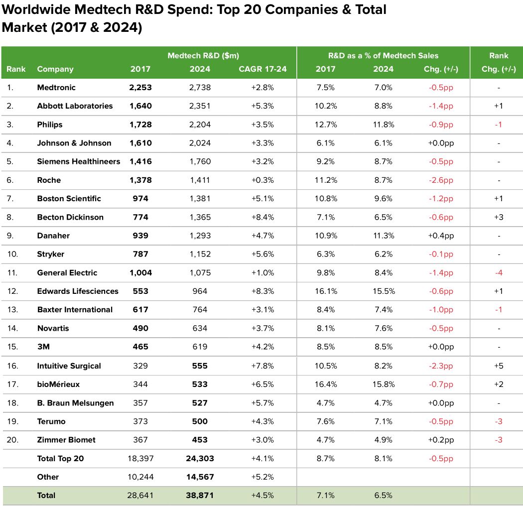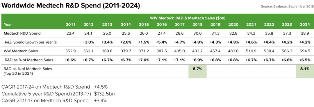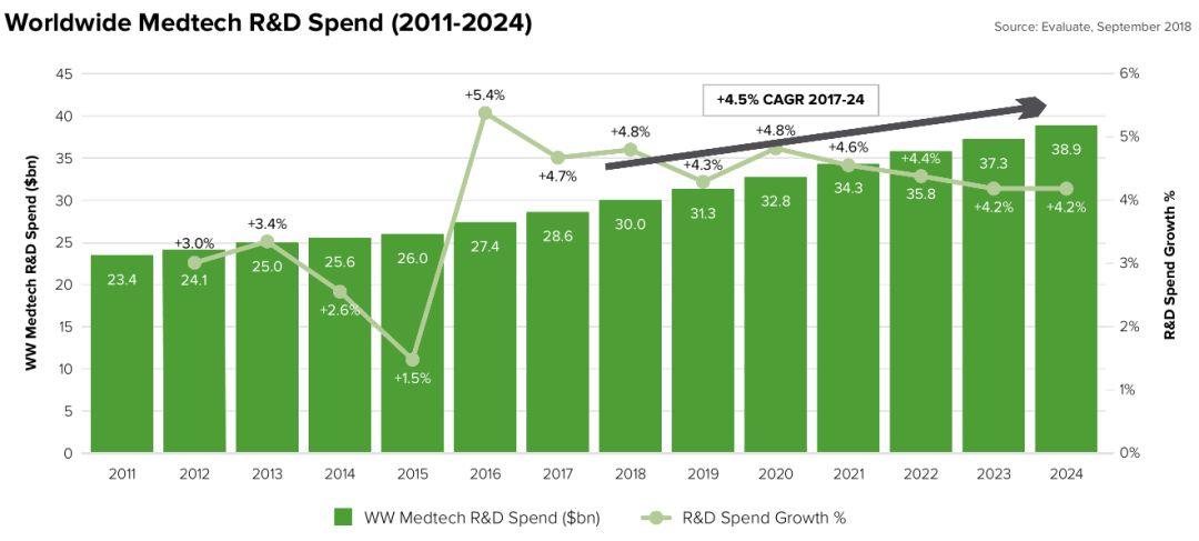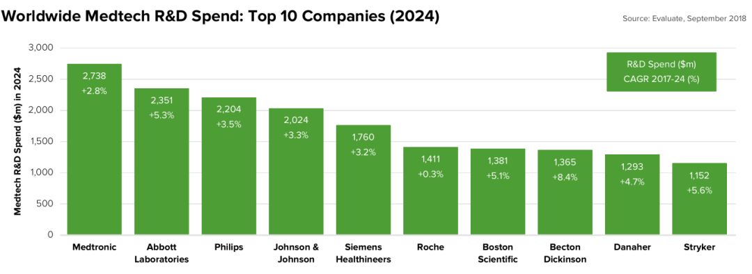 预计到2024年,全球医疗器械厂家研发年均增速4.5%,达到390亿美元。其中美敦力的研发投入最大,预计为27亿美元。