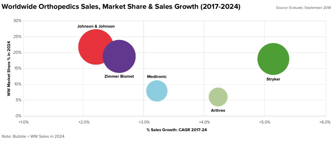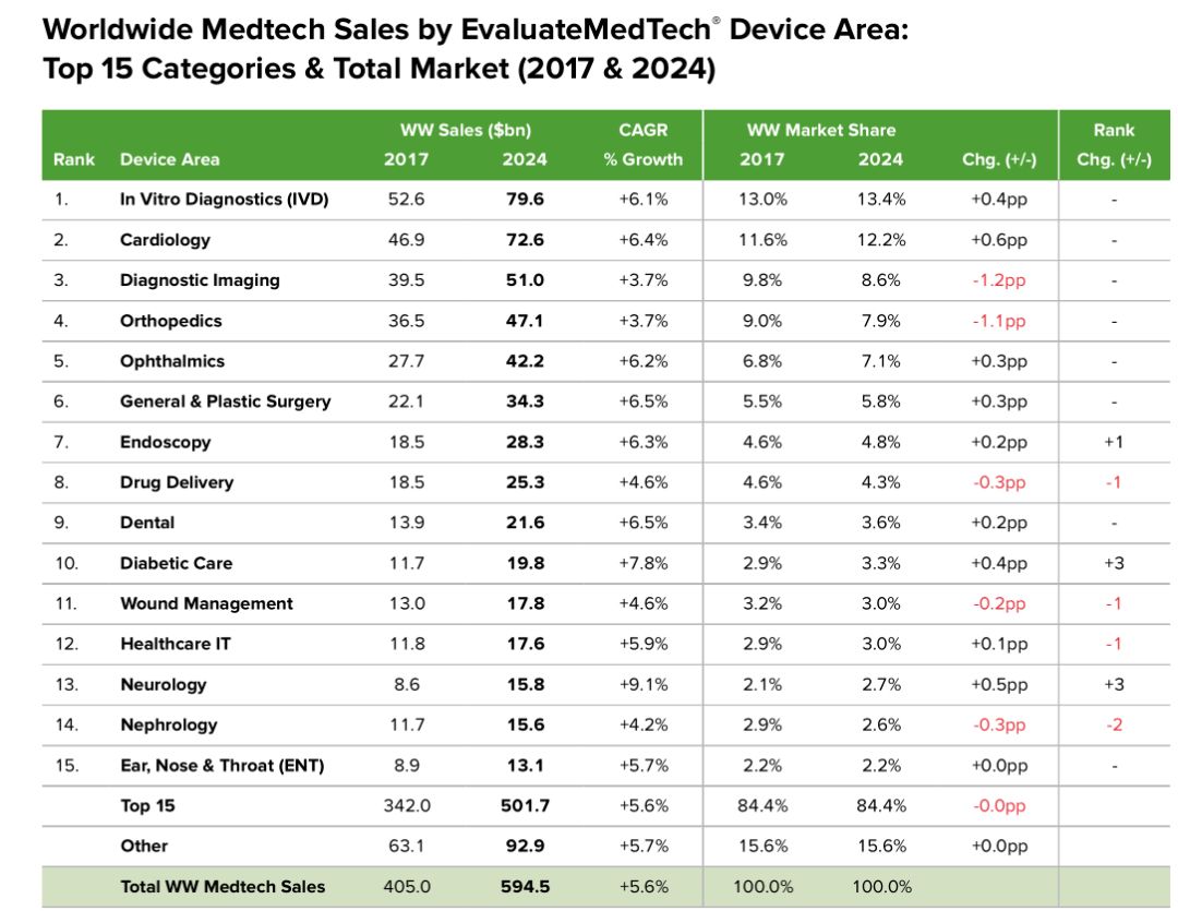 在2018版的EvaluateMedTech 全球预测中,我们认为从2017年到2024年,全球医疗器械市场的年均增速为5.6%。该分析是基于EvaluateMedTech对全球领先的300家医疗器械公司的深度预测模型。该销售预测仅仅是目前整个医疗器械市场的股票分析师的观点。