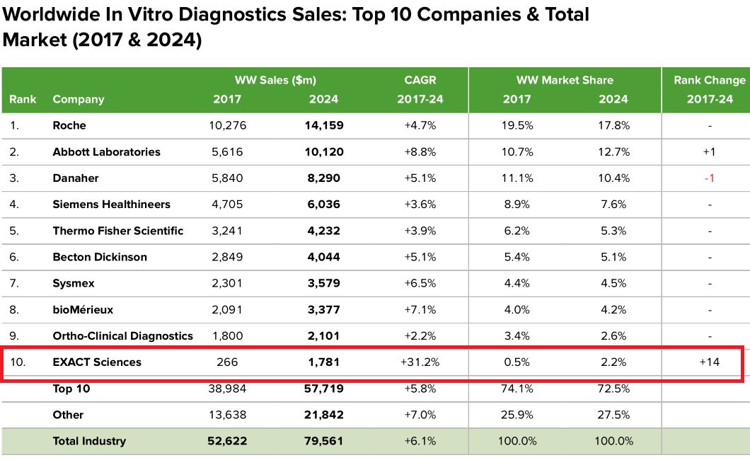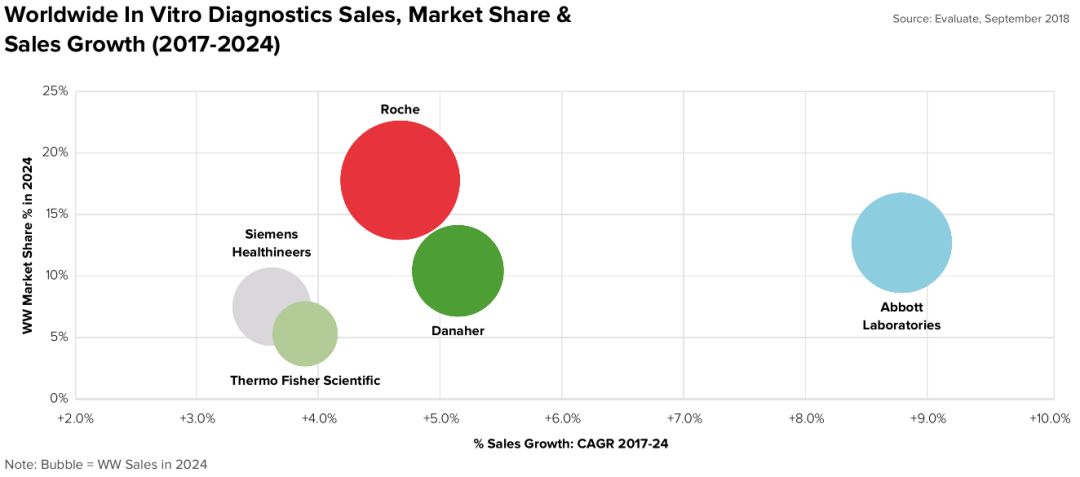 体外诊断领域在2024年仍旧占据头把交椅,预计市场规模796亿美元;其中罗氏的市占率预计为18%。