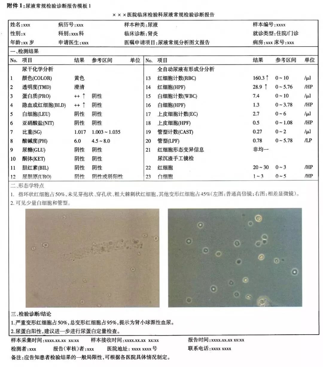 检测图像:一些对诊断有影响的关键检测图像应列出,例如尿液管型和白细胞增多的显微镜照片、红细胞位相图等,提供1~2张典型视野图片,或者一定数量的数字图像分析的形态学图片,作为检验诊断的重要依据。