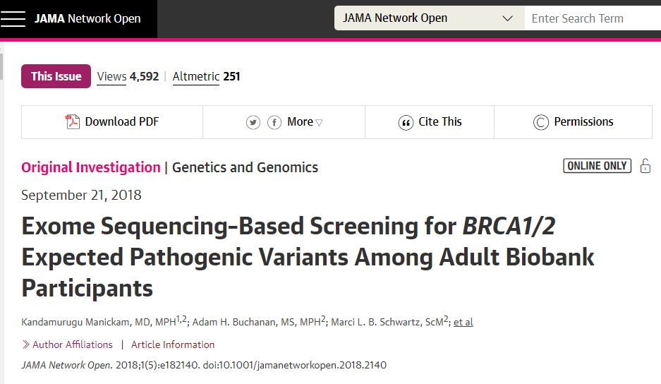 具体来说,这项研究纳入了50726名研究对象,平均年龄为60岁。在接受全外显子组测序筛查的人群中,有267人(148例为女性,119例为男性)存在BRCA风险变异,但只有18%的人在得知该研究结果之前就知道自己具有这种癌症风险因子。