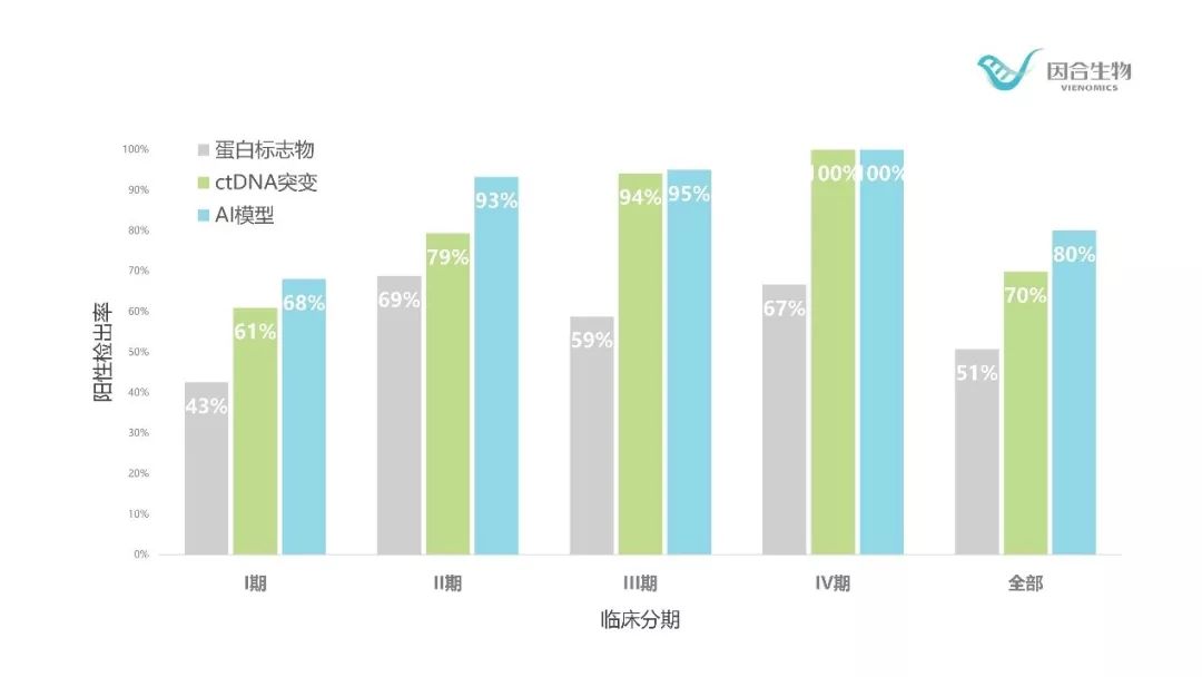最激动人心的结果是,通过因合生物通过将ctDNA、年龄、吸烟史、蛋白标志物等多种跟肺癌相关的因素纳入到多维AI模型中,采用10-fold-cross-validation对结果进行交叉验证,结果显示在保证特异性为99%时,可以将总体灵敏度提高到80%,显著高于单独使用一个指标进行判断,在各个肺癌分期中其检出率也高于使用单一的指标,如下图所示。