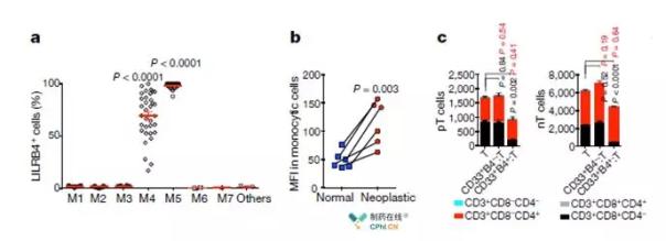 研究人员对105名AML患者的LILRB4的表达情况进行研究,发现LILRB4主要表达于单核细胞和单核急性髓性白血病细胞,且单核急性髓性白血病细胞表达水平更高。将将LILRB4阳性(B4+)或阴性(B4-)的肿瘤细胞与病人T细胞或健康人T细胞共培养,发现LILRB4阳性细胞可抑制T细胞增殖。