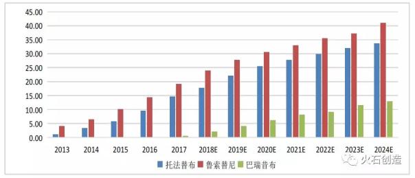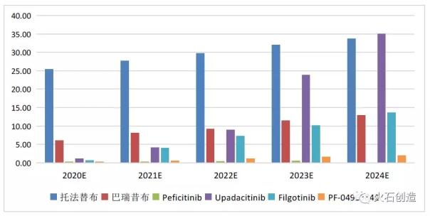 表2.已获批上市的JAK抑制剂 鲁索利替尼作为首个专门用于治疗骨纤维化的药物,虽然获批的适应症发病率较小,但临床高度未满足,且随着适应症的不断扩展,以及其有望进一步在实体瘤中应用,近几年市场不断攀升,并预计在2024年达40.99亿美元,实属JAK抑制剂中的重磅炸弹。 JAK抑制剂在RA领域的成功应用,打破了传统风湿类药物和生物药的治疗途径。与传统治疗药物及生物类抗风湿药相比,兼具可改善病情、安全性好、口服用药便捷等优势,为类风湿关节炎治疗提供了新的治疗策略,因此JAK抑制剂在国外权威指南中具有与生物制剂同等的治疗地位。且近年来随着对其机理的不断深入研究,JAK抑制剂在临床应用方面也不断扩展,获批以及在研的适应症还包括溃疡性结肠炎、红斑狼疮、特应性皮炎以及强直性脊柱炎等自身免疫性疾病。托法替布作为首个获批上市的口服类风湿关节炎治疗药物,有着市场的先发优势,2017年市场已达14.57亿元美元,并且预计2024年可达33.68亿美元。 巴瑞昔布作为第二个口服给药获批的RA治疗药物,其优异的临床有效性结果,且与托法替布相比为每日一次给药,曾一度被业界看好有望超越托法替布的另一款JAK抑制剂的重磅炸弹。然而,其在FDA的上市申请因为血栓栓塞风险的安全性担忧问题而遭挫。虽然提前重新提交的申请使得其他JAK抑制剂难以轻易将其排挤出市场,但对其商业价值也带来了一定的损害。并随着市场后来者的竞争,分析师预测该药物在2024年仅达12.91亿美元左右。 图1. 已上市JAK抑制剂市场(亿美元)
