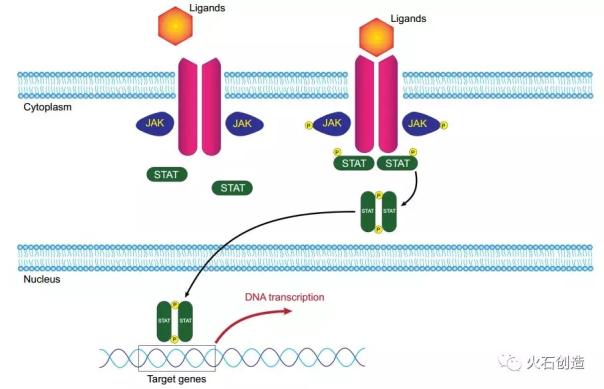 图1. JAK/STAT信号通路图 JAK-STAT信号通路功能广泛,参与细胞的增殖、分化、凋亡以及免疫调节等许多重要的生物学过程。JAK家族有4个成员:JAK1、JAK2、JAK3和TYK2,其中,JAK1、JAK2和TYK2广泛存在于体内各种组织和细胞中,JAK3主要存在于骨髓细胞、胸腺细胞、NK细胞及活化的B淋巴细胞、T淋巴细胞中。基于JAK激酶家族中各亚型的功能特点和特殊的组织分布,JAK1已成为免疫、炎症和癌症等疾病领域的新型靶点;JAK2已成为血液系统相关疾病治疗和预防的确切作用靶点;JAK3已成为治疗自身免疫性疾病的热门靶标。