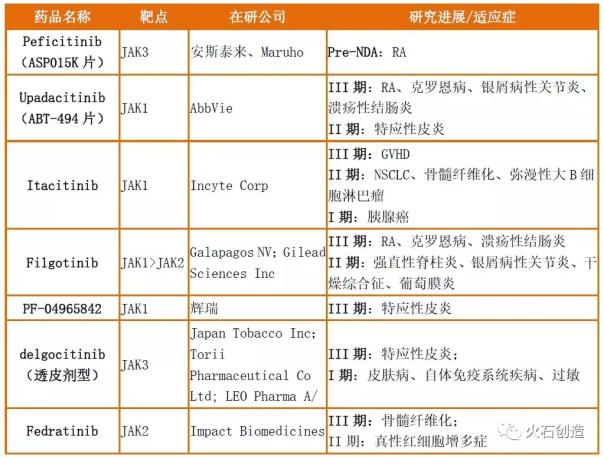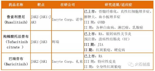 表1. JAK缺陷或抑制的影响 二、国外JAK抑制剂的竞争分析 目前,全球共有三款JAK抑制剂获批上市。2011年,首个由美国Incyte公司开发的JAK抑制剂鲁索利替尼(Ruxolitinib)在美国批准上市,是第一款专门用于治疗骨髓纤维化的药物。2012年,随着托法替布(Tofacitinib)被FDA批准用于治疗类风湿关节炎(RA)后,2017年,由Incyte和Eli Lilly合作开发的Baricitinib首先在欧洲获得上市许可,但其在FDA的上市申请遭到拒绝;在完善相关临床试验后,2018年1月Baricitinib最终获得了FDA的许可,可谓一波三折。