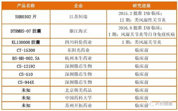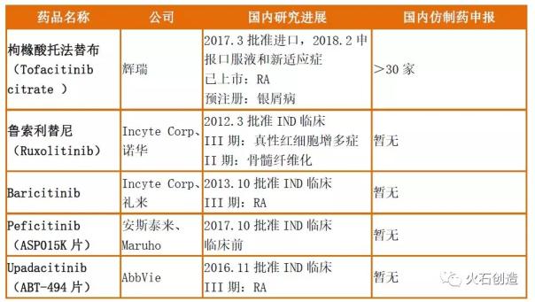 表4.JAK抑制剂原研进口中国申报状态 在仿制药研发方面,用于RA治疗的托法替布也是国内企业争相抢仿的对象。据火石创造数据库数据显示,国内已有超过30家药企申报了托法替布的仿制药,其中原料药最早获批临床的是江苏奥赛药业、制剂产品最早获批的是正大天晴。托法替布中国的化合物专利于2020年到期,但正大天晴对其提交了无效宣告请求,并2018年3月被宣告全部无效。若辉瑞不起诉,那么正大天晴的托法替布将很大可能拿下首仿,在2020年以前提前上市。然而,重磅炸弹鲁索利替尼由于获批的适应症多为罕见病,且原研迟迟未在国内获批上市等原因,目前暂无仿制药的申报信息。 除了托法替布仿制药之外,目前国内企业也在积极布局JAK的创新药,但国内在该靶点创新药的开发起步较晚,其中且进展最快的为恒瑞的JAK1抑制剂新药SHR0302,RA适应症的开发已进入临床II期阶段。海正药业的DTRMHS-07胶囊以及四川科伦KL130008胶囊也均进入I期临床阶段。另外,根据公开信息显示,国内还有多个JAK抑制剂处于临床前研究阶段。但在靶点亚型的选择上,已披露的信息显示多为选择性的JAK抑制剂。