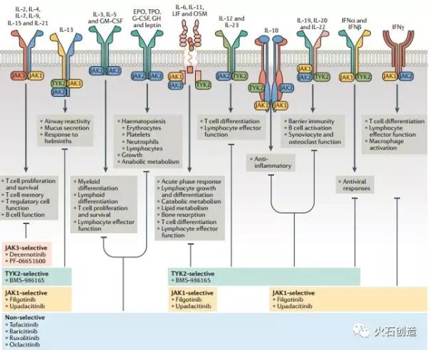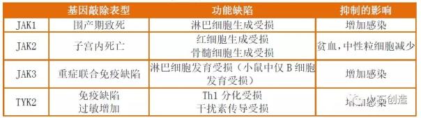 图2. JAKs激酶靶点分布图 然而,在抑制相关信号通路治疗疾病的同时也带来了一定的影响,例如JAK缺失或抑制可能会增加感染、贫血和中性粒细胞减少症等不良反应。4个成员缺损或抑制对身体的影响见下表。