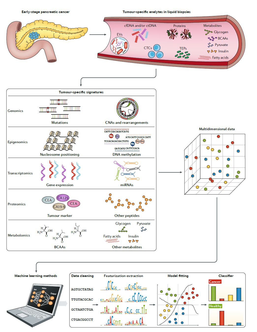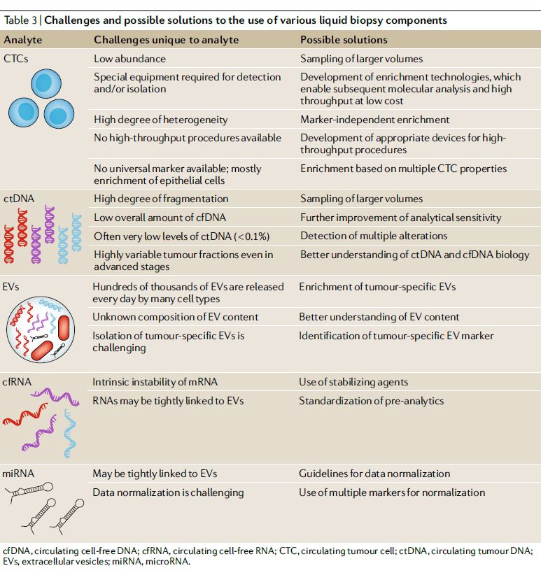 ▎药明康德编译整理(来源:《Nature Reviews Genetics》)精准肿瘤学的关键目标是改善癌症的诊断和治疗。而对肿瘤样本的一系列基因组和其它分子分析能够帮助发现标志物来帮助选择疗法,预测预后,跟踪肿瘤进化,以及发现不同转移性疾病的分子特征。基于下一代基因组测序(NGS)的分子分析方法已经在肿瘤分析方面得到应用,而综合DNA、RNA、蛋白质和表观遗传特征的多参数综合分析可能更准确地描述肿瘤特征并且帮助发现全新成药靶点。 目前,精准肿瘤学的焦点愈发转向液体活检,因为它不具侵袭性,而且可以在不同时间点重复进行,从而帮助监察疾病的进展。如今,外周血液中可以被检测的分析物(analyte)包括循环肿瘤细胞(CTCs);循环无细胞DNA(cfDNA),在癌症患者中它包含循环肿瘤DNA(ctDNA)。其它分析物物包括循环无细胞RNA(cfRNA);细胞外囊泡(EVs),例如外泌体和肿瘤“教育”的血小板(TEPs);蛋白质和代谢产物。近日,《Nature Reviews Genetics》 对在精准肿瘤领域液体活检的现状和未来进行了盘点,在今天的这篇文章里,药明康德的微信团队将与读者分享这篇综述的精彩内容。 ctDNA作为生物标志物的利与弊 ctDNA检测是目前市场上最常见的液体活检形式,它在具备巨大潜力的同时,在检测开发和临床应用的推广方面也面对着一系列挑战。 ctDNA作为精准肿瘤学生物标志物的潜力 研究表明,ctDNA可能由凋亡细胞释放,因此,它只代表了肿瘤细胞的一种特定亚群。尽管如此,ctDNA具有多个优点: 1. 它能够提供对肿瘤基因组的综合描述,因为ctDNA从多个不同肿瘤区域或多个病灶处释放,ctDNA分析可以发现组织活检中无法发现的体细胞突变。 2. 深度测序可以发现肿瘤内异质性和只在部分细胞中出现的基因突变。这通常需要大量的CTCs或者多次组织活检才能获得同样水平的信息。 3. ctDNA可以提供肿瘤大小的信息,从而反映出疾病的发展状态和对疗法的反应。研究发现,在非小细胞肺癌(NSCLC)和高级别浆液性卵巢癌(HGSOC)中ctDNA的突变等位基因频率(VAF)与肿瘤体积呈线性关系。 4. ctDNA还具备预测预后的价值。例如,在旨在治愈的手术或化疗之后,ctDNA的出现是癌症复发和不良预后的有力标志。它预测癌症复发的能力在结肠癌、卵巢癌、肺癌和乳腺癌患者中都得到了验证。 5. ctDNA分析能够发现肿瘤抗性的标志物,例如,在接受抗EGFR疗法的结直肠癌患者中出现的KRAS突变,以及在乳腺癌患者中的PIK3CA、MED1、或EGFR上VAFs的升高。 这些优点让ctDNA成为精准肿瘤学应用方面前景看好的分析物。然而ctDNA检测也需要克服血浆中ctDNA水平过低,细胞衰老带来基因变异的影响等挑战。 ▲组织活检与ctDNA检测特点对比(图片来源:参考资料[1])血浆中低水平ctDNA带来的挑战 在血浆cfDNA中检测到基因突变的能力与肿瘤负担有对应的关系。但是在不同患者身上的ctDNA水平可能相差很大,虽然他们患上同样类型的癌症。即使是在转移性癌症患者中,也有很大一部分患者血浆中ctDNA的比例异常的少。这清楚地表明,除了肿瘤负担以外,还有其它生物因素影响肿瘤DNA的释放。 据估算,1毫升血浆中含有大约1500个基因组当量(GE)的DNA片段,通常一次10毫升抽血可以从血样中获得4毫升血浆,意味着能够获得6000 GE的DNA片段。在VAF为0.1%的情况下,在这6000 GE的DNA片段中,平均只有6个DNA分子携带着想要检测到的基因突变,而且随机取样可能会影响这一数值。因此,可靠、准确并且可重复地检测到这些基因突变是一个严峻的挑战。 检测低水平ctDNA的方法 如果增加血样体积,可以检测到的分子数目自然会显著上升,但是多抽血的办法通常在晚期癌症患者中无法实现。另外一种克服携带基因突变的分子数目过少的方法是同时检测多种基因突变,然后确定一个基因突变数目的最低阈值来决定血浆样本是否为肿瘤阳性。例如,有的液体活检可以同时检验患者是否携带18种单核苷酸位点变异(SNV),如果检测到的SNV数目超过2个,则将ctDNA样本定义为肿瘤阳性。 近年来ctDNA检测技术的开发主要聚焦于增强测序技术的分析敏感度。测序技术的敏感度会受到测序准确性和测序深度的影响。通过使用分子条形码标记被测序的DNA片段,可以提高测序的准确性,从而提高发现基因突变的几率。 另一种提高敏感度的尝试是富集特定长度的ctDNA片段。有研究表明ctDNA 片段(132-145个碱基对)通常比健康细胞释放的cfDNA片段(~166碱基对)小。因此,富集特定大小的DNA片段进行测序可能提高发现基因突变的敏感度。 ▲影响循环无细胞DNA检测敏感度的因素(图片来源:参考资料[1])细胞衰老对ctDNA检测的限制 虽然这些技术的进步能够改善发现低VAF基因突变的能力,但是衰老细胞积累的体细胞突变也会对ctDNA的实用性添加限制。其中一个重要的干扰因素是良性体细胞基因突变随着细胞衰老而增加。在成人干细胞中出现的良性基因突变会随着细胞增殖传给下一代,有的时候在肿瘤驱动基因中出现的基因突变会导至携带这些突变的干细胞增殖速度更快,这可能被误认为肿瘤增生。因此,在肿瘤驱动基因中发现基因突变并不等同于发现癌症。 ctDNA检测的分析效度和临床有效性仍需确认 在临床护理中采纳肿瘤生物标志物检测的原则有三条:1. 分析效度(analytical validity),指的是检测的准确性、可靠性和可重复性;2. 临床有效性(clinical validity),指的是检测能够把患者分为不同群体,而且这些群体会有