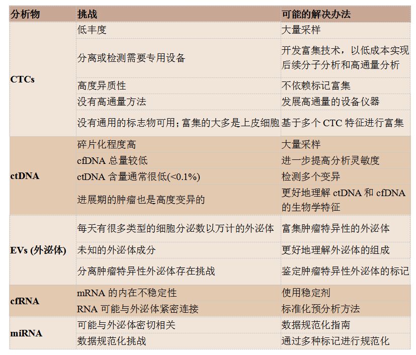 国内外布局肿瘤早筛的液体活检公司 资料来源:宽华投研团队整理 二 面临的问题 尽管液体活检优势明显、应用场景广阔、市场潜力巨大,但是其在检测开发和临床应用的推广方面也面对着一系列挑战。 2.1 技术缺陷 液体活检可检测的分析物有多种,但是每种分析物的检测都充满挑战,如CTC的丰度较低,ctDNA在不同患者中的水平可能相差很大。对于肿瘤早期筛查而言,检测对象的浓度较低,对检测技术的灵敏度要求极高。另外,液体活检并不适用于所有类型的肿瘤,由于血脑屏障会阻碍ctDNA和CTC进入血液,比如,胶质母细胞瘤释放到外周血中的ctDNA和CTC极低,并不适合液体活检。