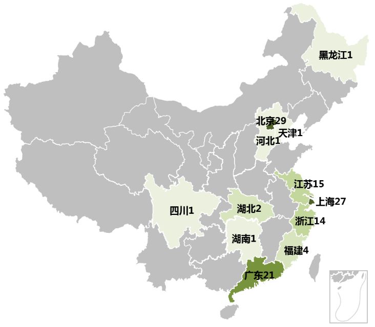 固体活检和液体活检分析物的比较 资料来源: Ellen Heitzer et al. Nature Reviews Genetics 2018,宽华投研团队整理 1.4 市场竞争激烈,产品大多采用(类似)LDT的模式 液体活检领域虽然拥有潜在的巨大市场空间,但是竞争非常激烈。根据宽华投研团队统计,目前国内有116家公司从事液体活检技术的开发。这些公司主要分布在北京市(29家)、上海市(27家)和广东省(21家)。紧随其次,江苏省(15家)和浙江省(14家)也有较多的公司布局液体活检领域。