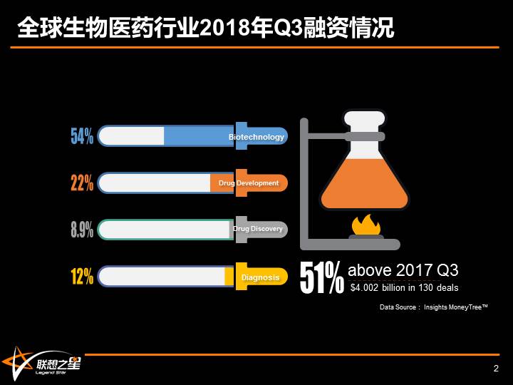 在几个超级大deal close的拉动下,2018年第三季度,全球生物医药行业共完成了130笔风险投资交易,总共募集资金40.02亿美元,同比增长51%,头部项目吸金效应明显。