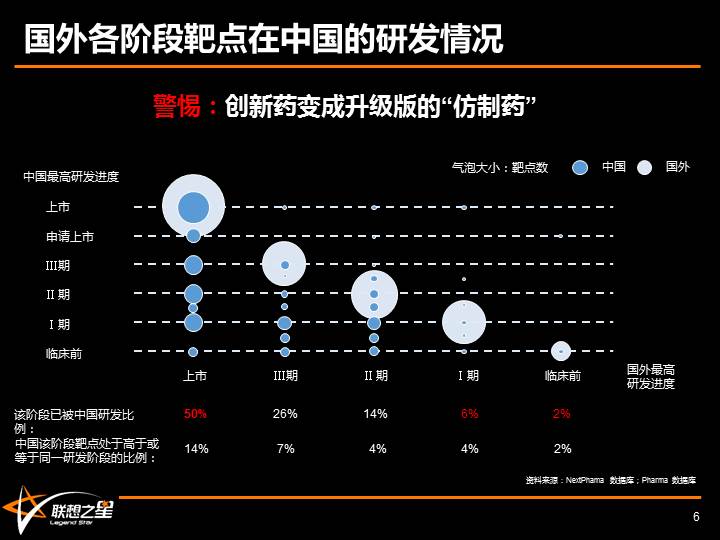 从这张国外各阶段靶点在中国的研发情况可以看出:中国在研新药靶点主要以追随为主,在国外已上市的新药靶点已有一半被中国企业覆盖,但国外处于临床Ⅰ期及以前的靶点覆盖率则不到10%。