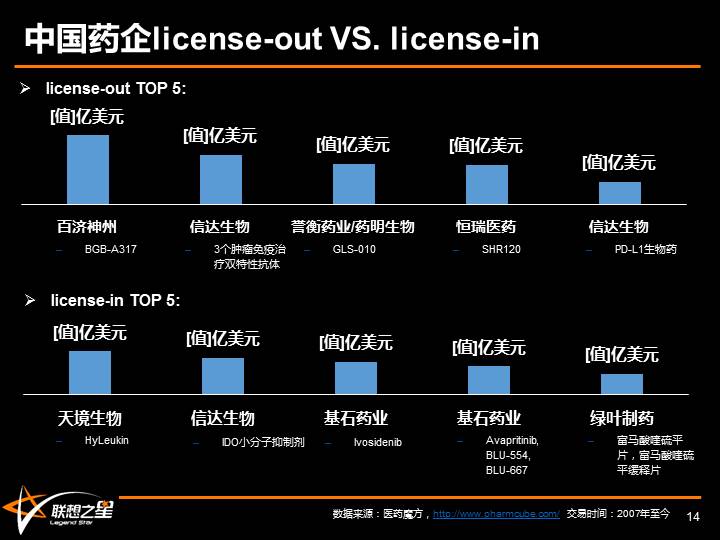 联想之星技术投资策略演变:这个图展示的是国内外联合开发的情况,从金额的角度,中国license out的合同金额整体比license in高,一定程度体现了近些年中国新药研发水平确实发生了实质性提高,有了国际对话的能力。