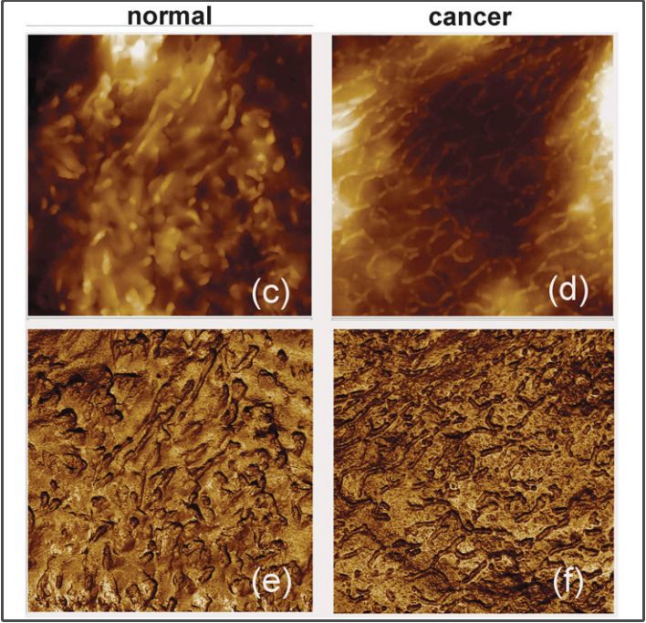 研究人员发现,从癌症患者尿液中提取出的膀胱细胞具有独特的表面特征,利用原子力显微镜可以将其与健康个体的膀胱细胞区分开来,因此这种方法具有极大的潜力用作诊断工具。不仅如此,该诊断方法与机器学习相结合后,能够更精确的识别细胞表面特征,例如粘附性、粗糙度、方向性以及分形特性等,从健康细胞中将癌变细胞区分出来。 癌细胞与正常细胞在显微镜观察下具有不同的特征(左列为正常细胞,右列为癌细胞观察结果)