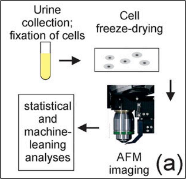 由塔夫茨大学科学家研发的一种新型无创检测技术,仅需患者的尿液样本,就能比当前应用的侵入性临床筛查技术更加简单和精确的预测膀胱癌的发生。经验证,这项基于原子力显微镜(AFM)的液体活检技术,在膀胱癌的检测上特异性达到了82%-98%!灵敏度更是超过了90%! 这项研究最新发表在国际顶级期刊《PNAS》上。值得注意的是,这也是原子力显微镜首次成功的应用于临床诊断。研究人员通过原子力显微镜,对癌症患者尿液中的细胞进行纳米级别的观察,发现癌症患者尿液中的细胞具有独特的特征。 显微镜探针对细胞表面进行“描绘” 研究人员强调,这项无创技术不仅可用于膀胱癌的检测,对于上尿路、尿道、胃肠道、结直肠、宫颈以及呼吸系统癌症的检测同样潜力无穷。不仅如此,这项技术还可用于监测细胞对各种药物治疗的反应。因此,这项新型检测方法可能为诊断成像的发展指明了全新的方向! 膀胱癌是最常见的恶性肿瘤之一,在我国发病率居所有泌尿系统肿瘤首位。据2015年中国癌症年报统计,我国约有8.05万新患者,约有3.29万人死于膀胱癌。膀胱癌由于具有易复发、治疗周期长、单次治疗费用较高等特点,其治疗费用居于实体肿瘤首位。